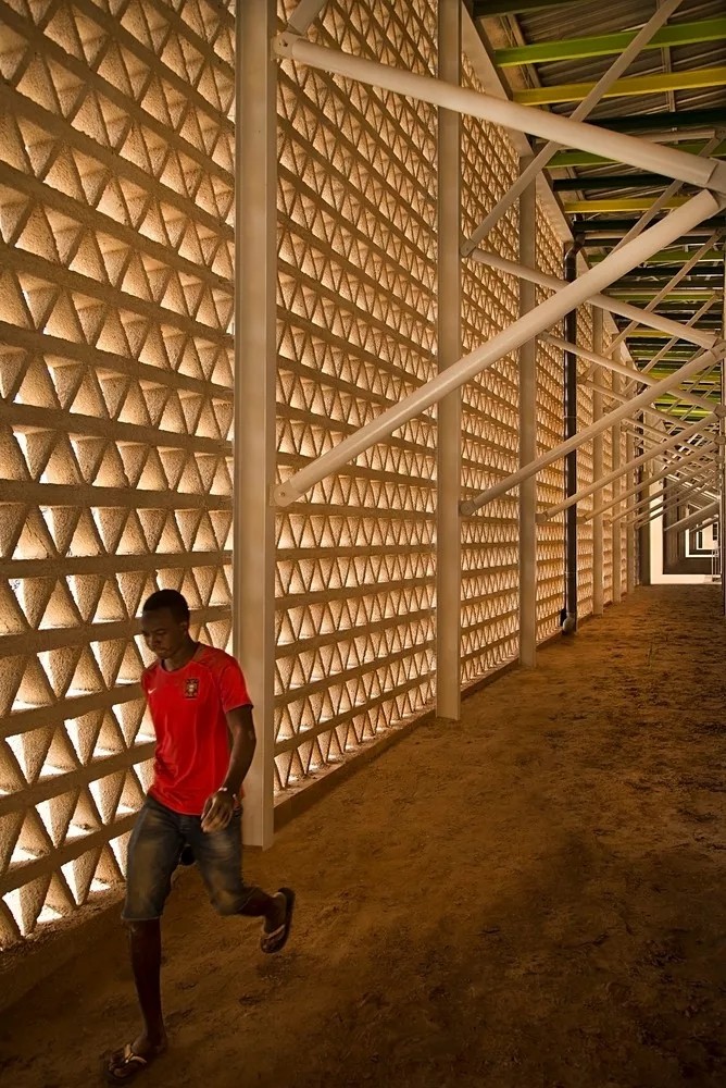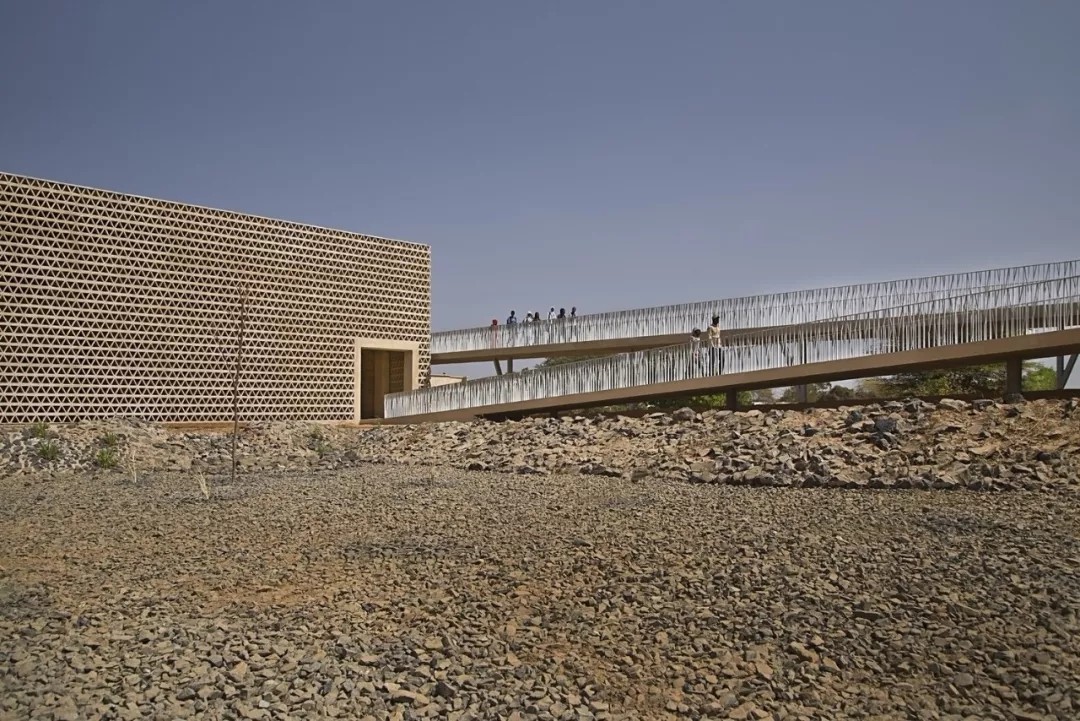 “班貝項(xiàng)目中,資源的稀缺引導(dǎo)了生物氣候策略設(shè)計(jì)的使用,其中包括一個大型雙頂天篷和伊斯蘭傳統(tǒng)柵格,它們在避免太陽輻射的同時能讓空氣自然流通。 通過采用熟悉的施工技術(shù)和遵循可持續(xù)性原則,它成功地將建筑成本和維護(hù)需求降至最低,同時仍闡釋出了一中大膽的建筑表達(dá)?!?br/>