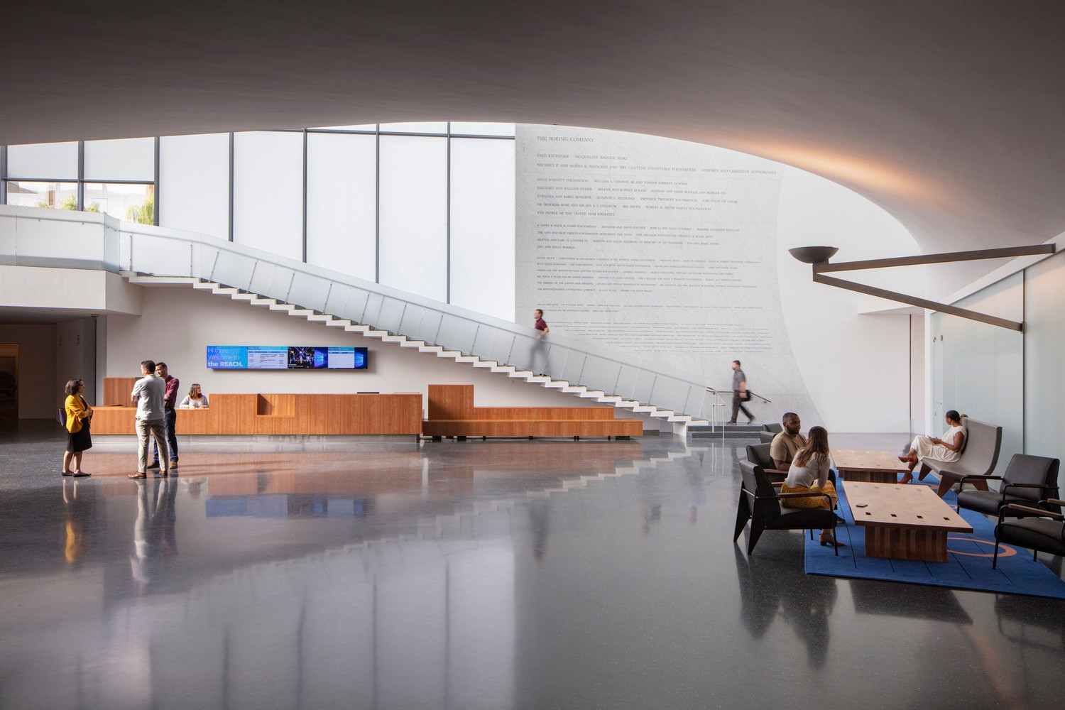 該項(xiàng)目占地4.6英畝(約18,616平方米),包括三座相互連接的場(chǎng)館,11個(gè)設(shè)有落地窗的空間,室內(nèi)空間為72,000平方英尺(約6,689平方米),為藝術(shù)、表演和教學(xué)提供11個(gè)靈活性強(qiáng)的空間。REACH采用一系列有角度的現(xiàn)澆混凝土結(jié)構(gòu),一半位于地下。地上部分與周圍傾斜的景觀空間相融合,具有現(xiàn)代設(shè)計(jì)風(fēng)格。景觀的區(qū)域包括130,000平方英尺(約12,077平方米)的屋頂花園,和用于藝術(shù)裝置、表演和娛樂(lè)的草坪。