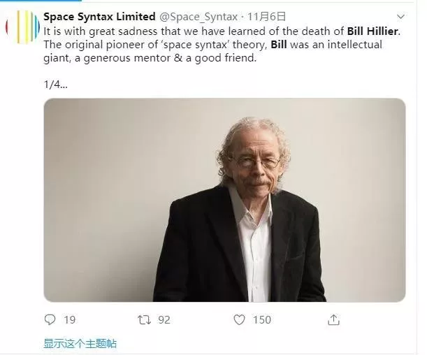 11月6日,空間句法在社交媒體發(fā)布了創(chuàng)始人Bill Hillier教授逝世的消息,行業(yè)同仁紛紛表示哀悼。