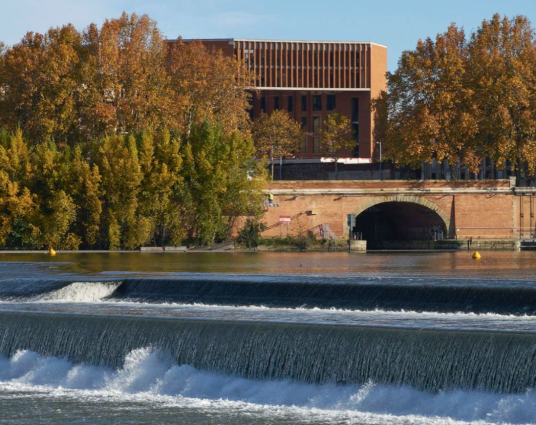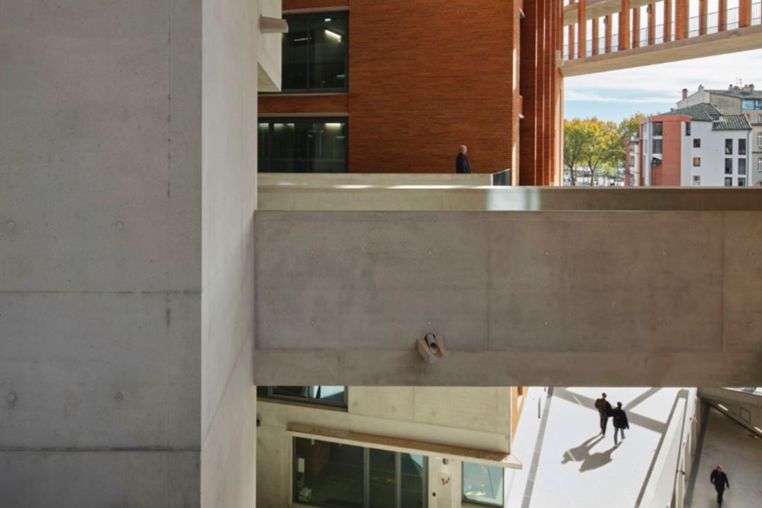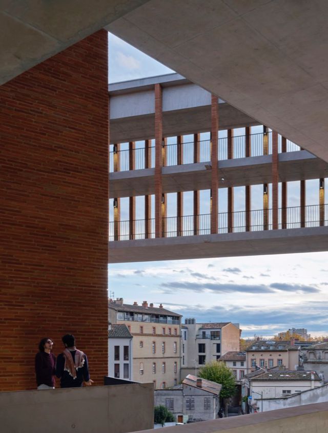 圖盧茲第一大學(xué)經(jīng)濟(jì)學(xué)院位于加龍運(yùn)河的一處轉(zhuǎn)彎,依建筑師的解讀,這座地上七層地下兩層的新建筑,“扶壁、墻體、坡道、酷炫神秘的內(nèi)飾、回廊和庭院.....這些是重新詮釋的圖盧茲元素的整合?!?/section>為提供舒適宜人的研究和教學(xué)場(chǎng)所,建筑從辦公室到研討室再到露臺(tái)的每個(gè)空間,都可以最大限度地引入新鮮空氣和自然采光,并充分保證通風(fēng)效果。這使她們能夠以立面充當(dāng)“深墻”,而幾乎不用留出窗口,來布置更大的建筑體量,控制光線陰影的明暗變化。