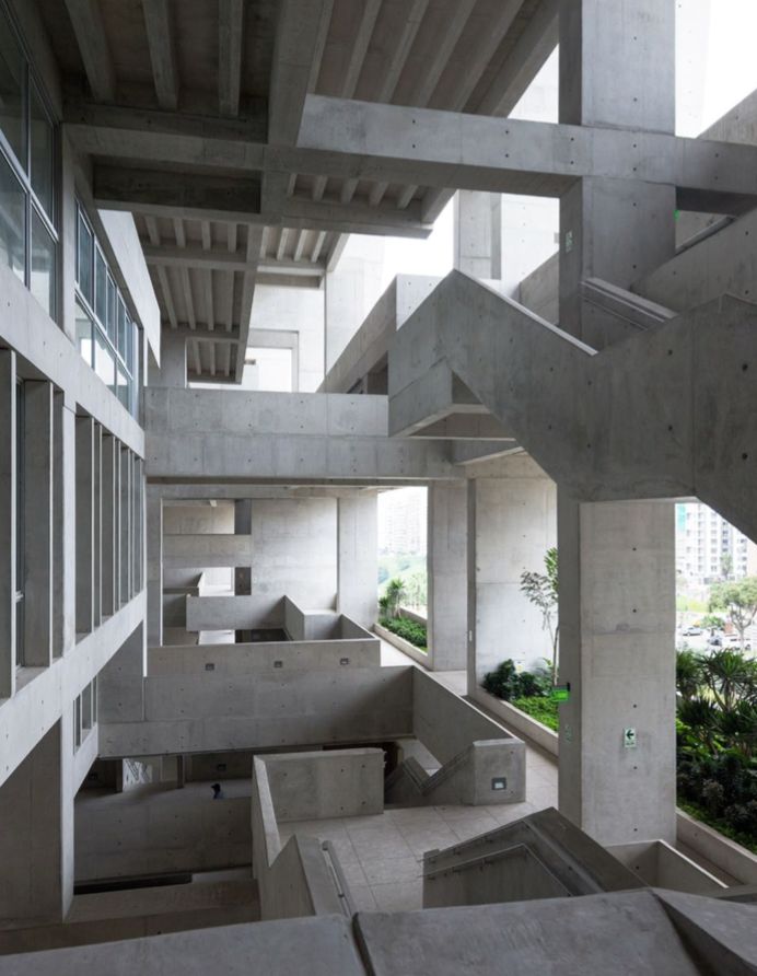 利馬工程技術(shù)大學(xué)坐落于一個(gè)極具高難度的建筑場(chǎng)地,一座充滿縱向元素的多層建筑拔地而起,靈感正是源自這座城市的懸崖峭壁?!敖ㄖ眰?cè)成為一面‘新懸崖’,而南側(cè)則以層疊花園和開放空間為特色,試圖與該地區(qū)較為低矮的城市住宅體量相融合?!?/section>建筑師們用未經(jīng)修飾的混凝土原始肌理呈現(xiàn)建筑的力量感,有人聯(lián)想到粗野主義。建筑結(jié)構(gòu)與建筑空間共同構(gòu)成新的循環(huán)景觀。剖面設(shè)計(jì)在整座建筑中不知不覺創(chuàng)造出大量自然而然的人性化聚集空間。較大的體量區(qū)域貼近地面,教學(xué)、行政區(qū)域和教師的辦公室在更高樓層交錯(cuò)分布??拷蓓?shù)纳蠈涌臻g是圖書館,城市和大海的全景在此盡收眼底。統(tǒng)而言之,這是一座以垂直的縱向形態(tài)為獨(dú)到特色的校園建筑,與當(dāng)?shù)氐臏貛夂颦h(huán)境相得益彰,也對(duì)秘魯?shù)牡匦螚l件與城市傳統(tǒng)有所借鑒。圖片來源:Iwan Baan