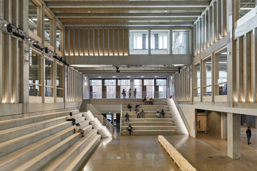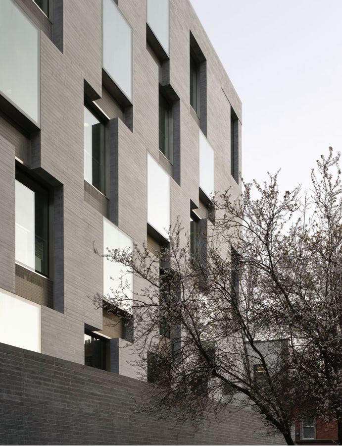 聯(lián)排建筑包括一個(gè)學(xué)習(xí)資源中心、舞蹈室、帶頂棚的庭院和咖啡館,并與校園地塊前方的城市景觀新規(guī)劃共同開發(fā)。六層建筑內(nèi)部采用開放式布局,由形成建筑立面的石頭柱廊統(tǒng)一包圍。建筑內(nèi)部由多個(gè)彼此連通的寬敞大廳構(gòu)成,相互重疊交織的兩層和三層空間穿插其中。入口大堂幾乎通高至建筑屋頂,樓梯仿佛懸吊于地板之間,形成雕塑般的藝術(shù)質(zhì)感,并同時(shí)將建筑各層緊密編織在一起。