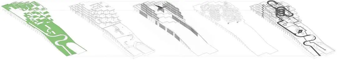 近日,上海楊浦區(qū)一座舊改建筑亮相,令人耳目一新。舊日的煙草倉庫被改造成一個(gè)集市政基礎(chǔ)設(shè)施、公共綠地和公共配套服務(wù)于一體的城市濱江綜合體。設(shè)計(jì)師利用現(xiàn)狀中煙草倉庫北側(cè)的規(guī)劃綠地延伸了城市一側(cè)的退臺,形成緩坡以對接城市,并在坡上覆土種植來建設(shè)公園,在坡下則布置停車和其他基礎(chǔ)服務(wù)設(shè)施,使人們不知不覺間便從城市漫步到江岸。整座建筑的上半部分同樣覆蓋著綠植,結(jié)合懸挑的樓梯和坡地以及江岸的連接,一座“綠之丘”得以形成。