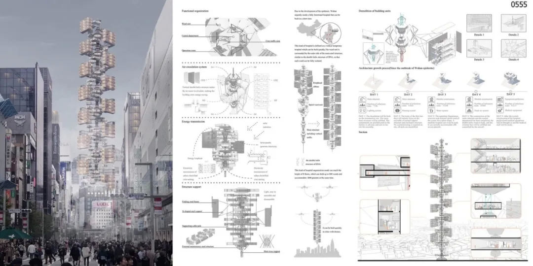 近日,2020年eVolo摩天大樓競賽獲獎作品公布,評委會從收到的473個(gè)項(xiàng)目中選出了3名優(yōu)勝者和22個(gè)榮譽(yù)獎。來自中國的作品“流行病通天塔”(Epidemic Babel)獲得冠軍。該項(xiàng)目設(shè)想了一個(gè)可快速部署的醫(yī)療摩天大樓,用于應(yīng)對流行病的大爆發(fā)。建筑采用鋼架結(jié)構(gòu),預(yù)制盒狀單元可以根據(jù)特定的需求插接其上,具有結(jié)構(gòu)簡單、反應(yīng)迅速的優(yōu)點(diǎn)。
