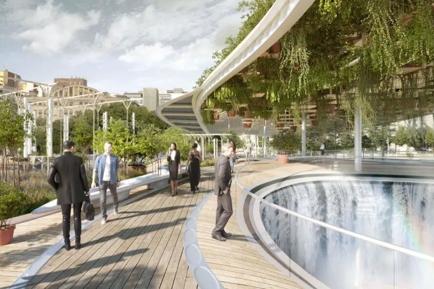 近日,Rescubika建筑工作室公布了懸于巴黎塞納河上的“巴比倫景觀橋”(Babylon Bridge)設(shè)計方案。該方案是一個大型城市門戶景觀設(shè)計項目的一部分,旨在以空中景觀的形式打造壯麗、愉悅的觀景體驗。橋上巨大的中央瀑布不斷涌入塞納河,為漫步經(jīng)過的行人帶來富有沖擊力的感官體驗,使他們暫時遠離車水馬龍的喧囂。大橋沿途還將建立對外開放的蔬菜園,向本地居民展示都市農(nóng)業(yè)的魅力。