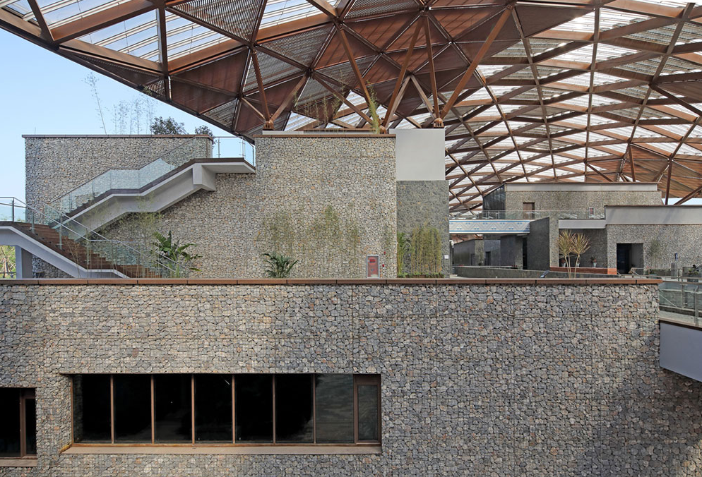 屋頂通過有序的曲折變化,使建筑形態(tài)與對面的峽谷山體走勢相呼應(yīng),同時充分考慮到了雨量較大時期迅速排水的需要。底層局部架空,承襲當?shù)貤U欄式建筑特色,高低錯落的隙間有效促進自然通風,同時豐富立面形態(tài)。