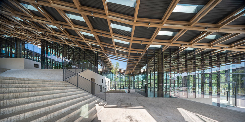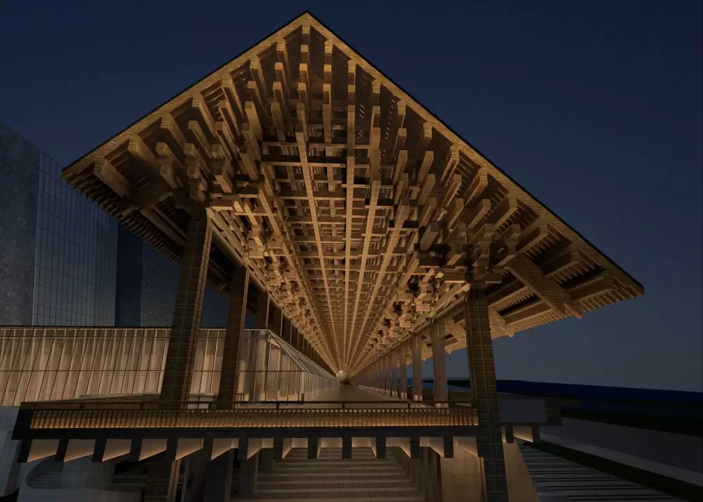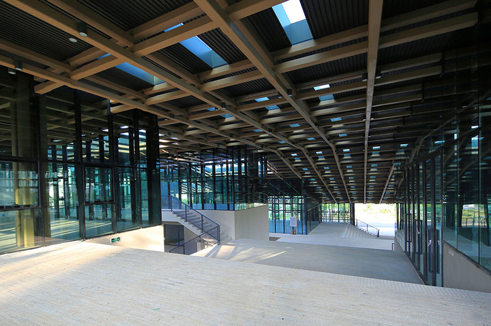 該中心位于深圳,占地面積為 2685㎡ ,其主要用途為:展覽、藝術(shù)研討會、演講、社交和休閑活動。整個項目就像是一個巨大的亭子,屋頂覆蓋著縱橫交錯的木橫梁,排布整齊的天窗也為室內(nèi)帶來了足夠的采光,這也讓室內(nèi)增添了一種有趣的光影變化。