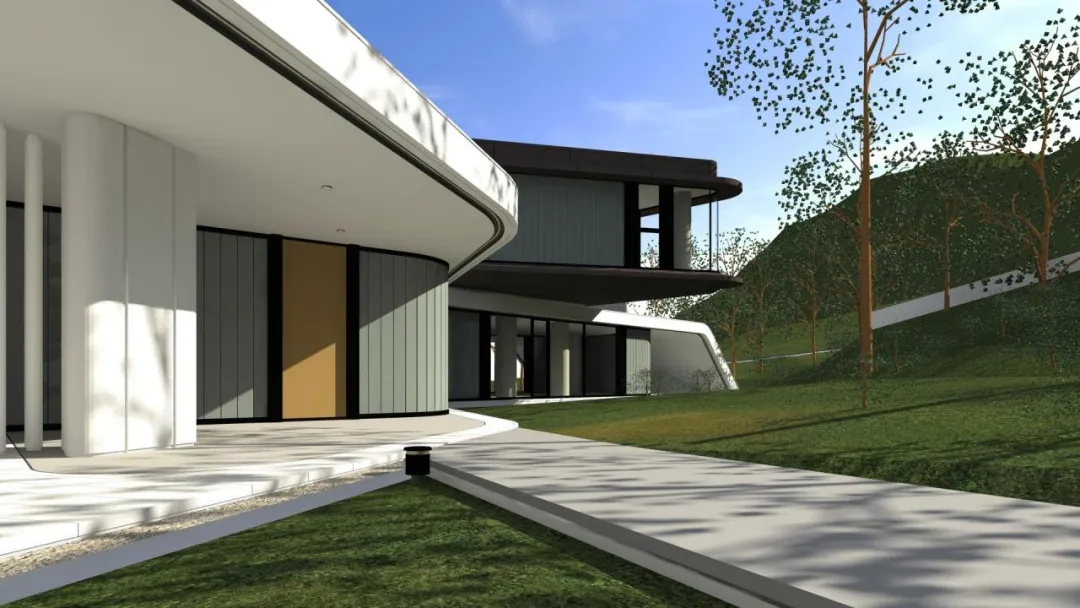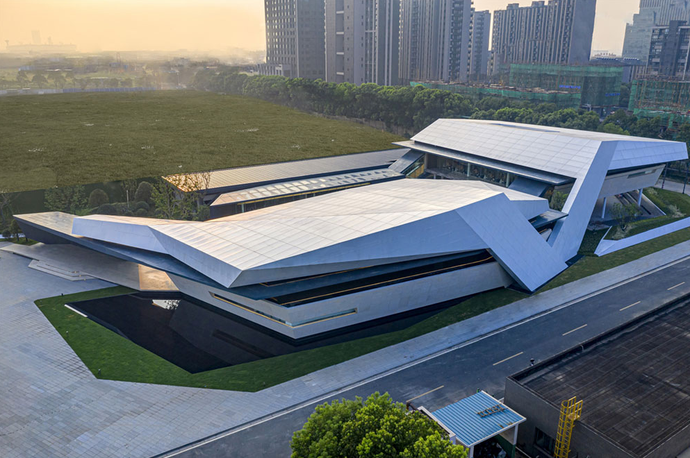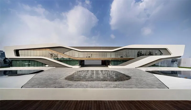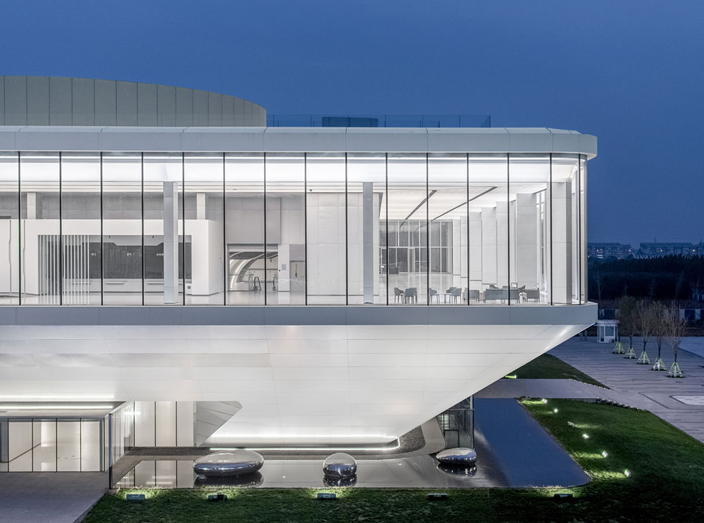 外部材質(zhì)以白、灰色鋁板搭配米色大理石,簡潔有力,嚴謹大氣,將幾何造型貫穿于室內(nèi)外空間。通過體塊的轉(zhuǎn)折穿插形成了空間感官上的透氣性,弱化了內(nèi)外空間的界限,同時順勢營造出不同的功能性空間。從一個建筑穿行至另一個建筑,整體動線呈現(xiàn)出高低錯落的動線走勢,經(jīng)過蜿蜒小徑,來到主展示區(qū)的城市展覽館,頗有先抑后揚、豁然開朗之勢。
