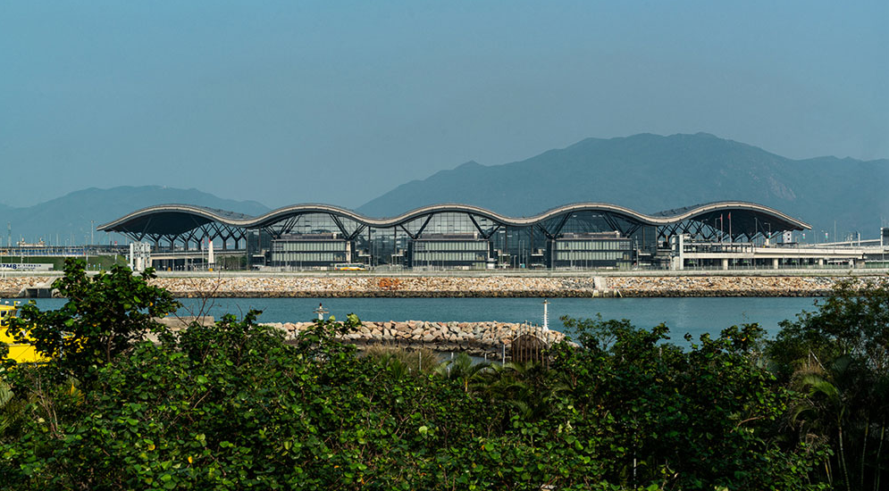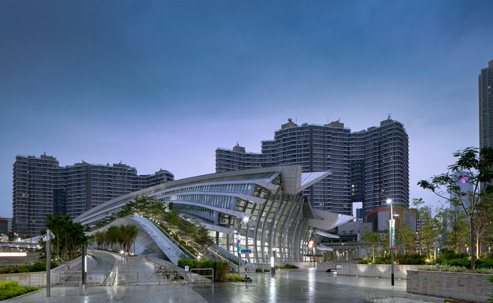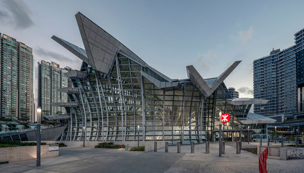 香港西九龍站位于西九文化區(qū)以北港鐵九龍站與柯士甸站之間,占地 11 公頃,總建筑面積達 40 萬平方米。站內(nèi)地下設(shè)有四層,地下一樓為售票大廳,地下二樓為抵港層,地下三樓為離港層,分別設(shè)置內(nèi)地口岸區(qū)和香港口岸區(qū),地下四樓為站臺,共有 15 條軌道,其中 10 條會在通車初期啟用,另有 5 條預(yù)留日后擴充。車站天幕呈流線型,由 4000 多塊大型玻璃組件以及 16000 多塊鋁板構(gòu)成,其中 90% 為不規(guī)則形狀,施工難度極高。