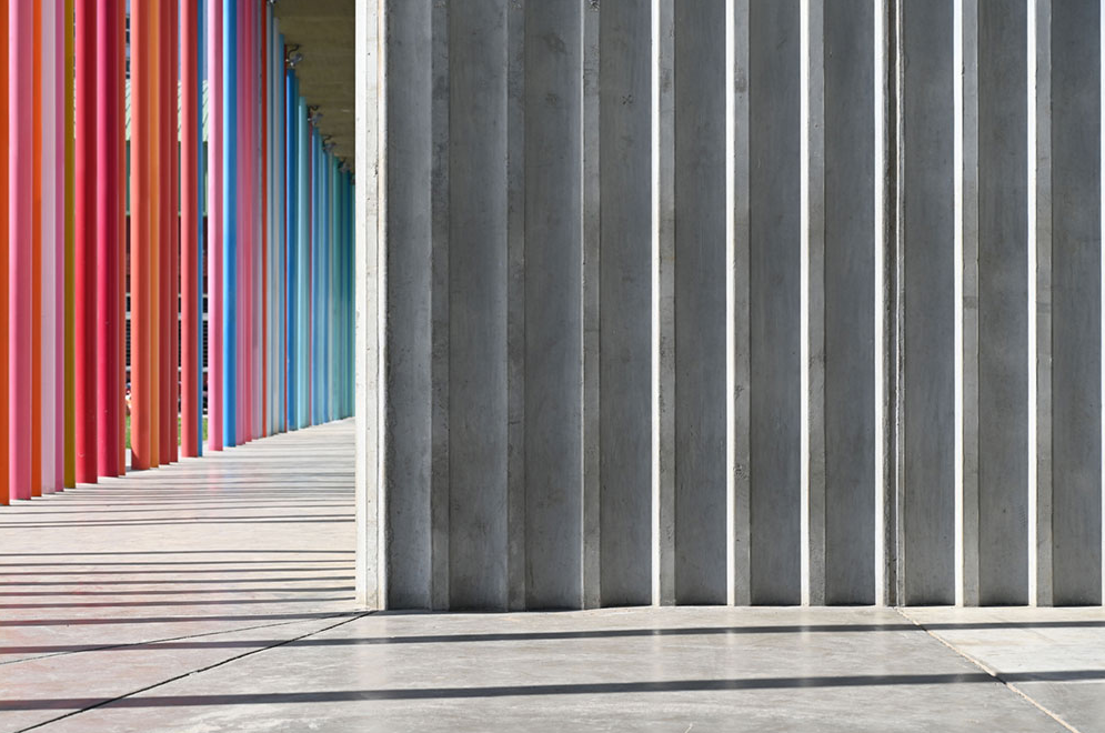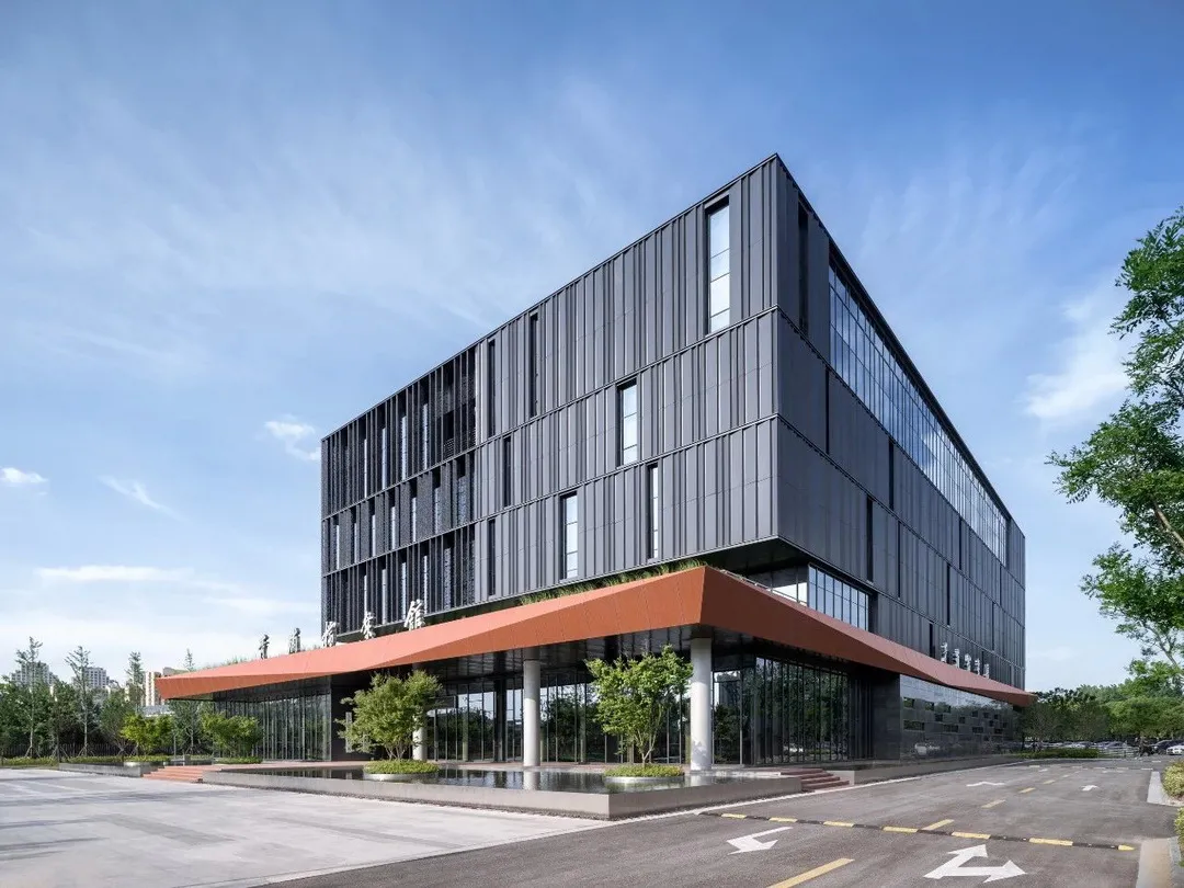 建筑主體的「外」表皮采用了灰色鋁單板格柵結(jié)合玻璃幕墻,很好地解決了建筑東西日曬的問題。整齊劃一的金屬板形成橫向線條,讓「外」表皮簡潔、純粹又現(xiàn)代,凸顯了「內(nèi)」的復(fù)雜和多變。