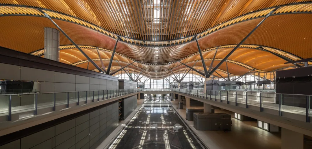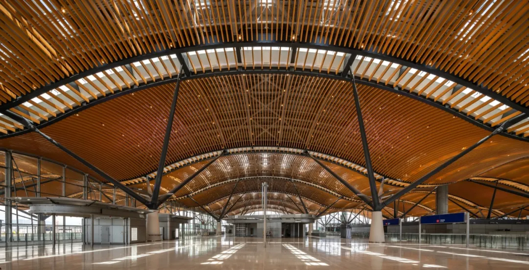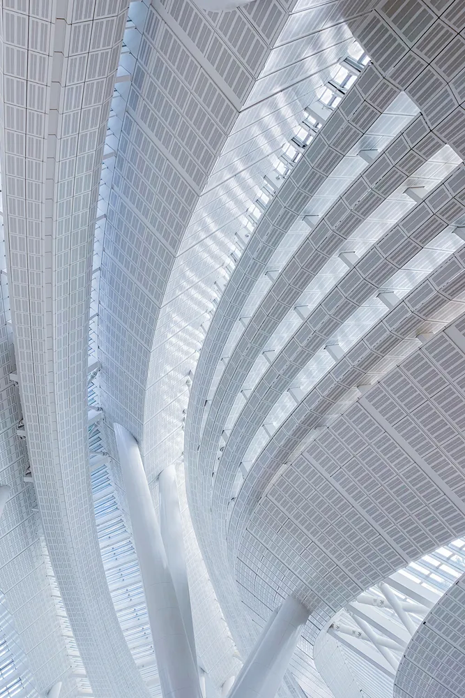 作為主要力學(xué)支撐的 V 型構(gòu)架設(shè)計,像一棵棵參天大樹張開枝杈,進入車站,讓人仿佛有置身原始森林的感覺。