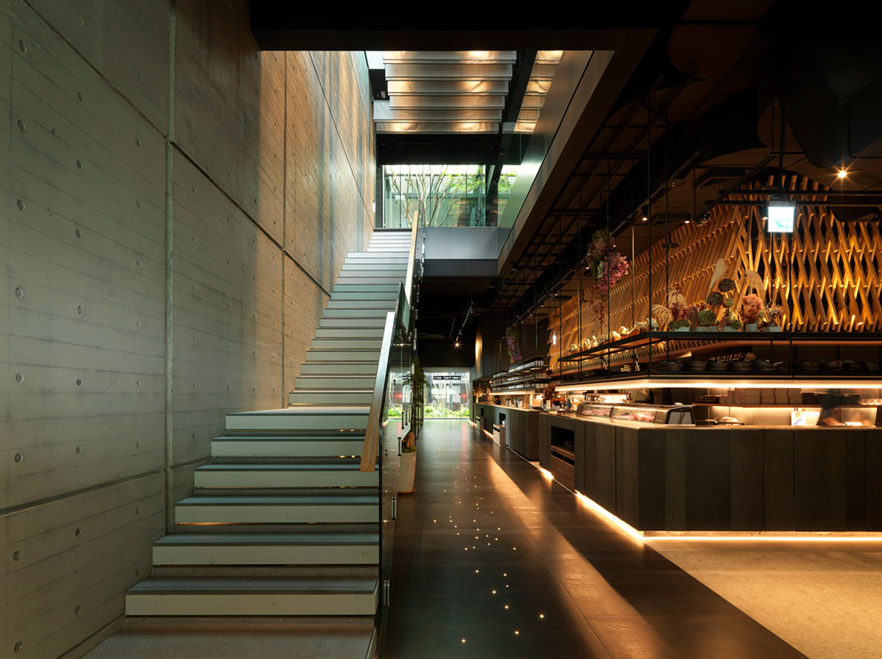 整個建筑外觀主要以灰色、白色和黑色為主,部分區(qū)域用紅色作為提亮處理。設(shè)計師還將多種材料合理分配使用,并通過色調(diào)和紋理搭配,以實現(xiàn)透明、半透明和不透明的視覺效果,呈現(xiàn)出江南地區(qū)建筑文化的層次性。