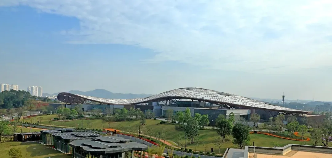園林藝術(shù)館是第十二屆中國(南寧)國際園林博覽會主場館。用地內(nèi)有兩座小山丘,設(shè)計上遵循了「自然優(yōu)先,建筑隱于環(huán)境」的理念。將山體開槽,一層展廳整體嵌入其中,減小建筑體量對自然環(huán)境的壓迫。二層小展廳的散布于山坡之上,營造出有地方傳統(tǒng)特色的空間氛圍。