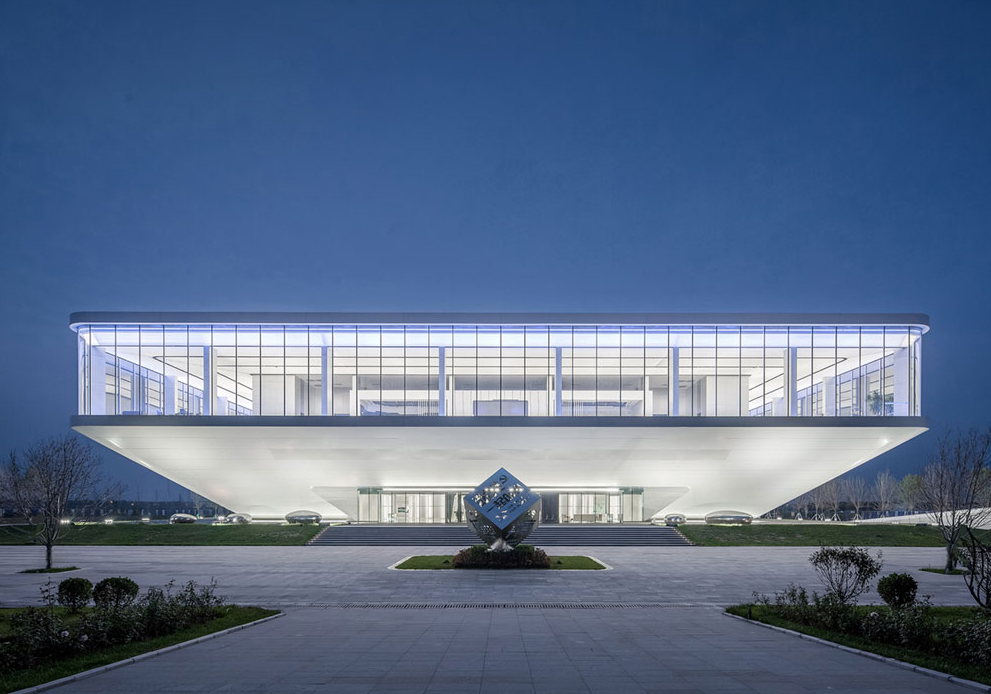 本項目位于江陰市,在緊鄰長江的高新區(qū)板塊 1.5 km處,設(shè)計師利用地理位置的優(yōu)勢,在此打造出一個城市藝術(shù)體驗中心,以此寓意著對整個城市未來的期許。設(shè)計師依托長江之上優(yōu)質(zhì)的水域環(huán)境,利用極具張力和表現(xiàn)力的幾何結(jié)構(gòu)呈現(xiàn)出大氣、純粹的建筑美學(xué),遠眺建筑的整體,在結(jié)構(gòu)的設(shè)計上如同一對展翅欲飛的翅膀,充滿力量感和律動感。