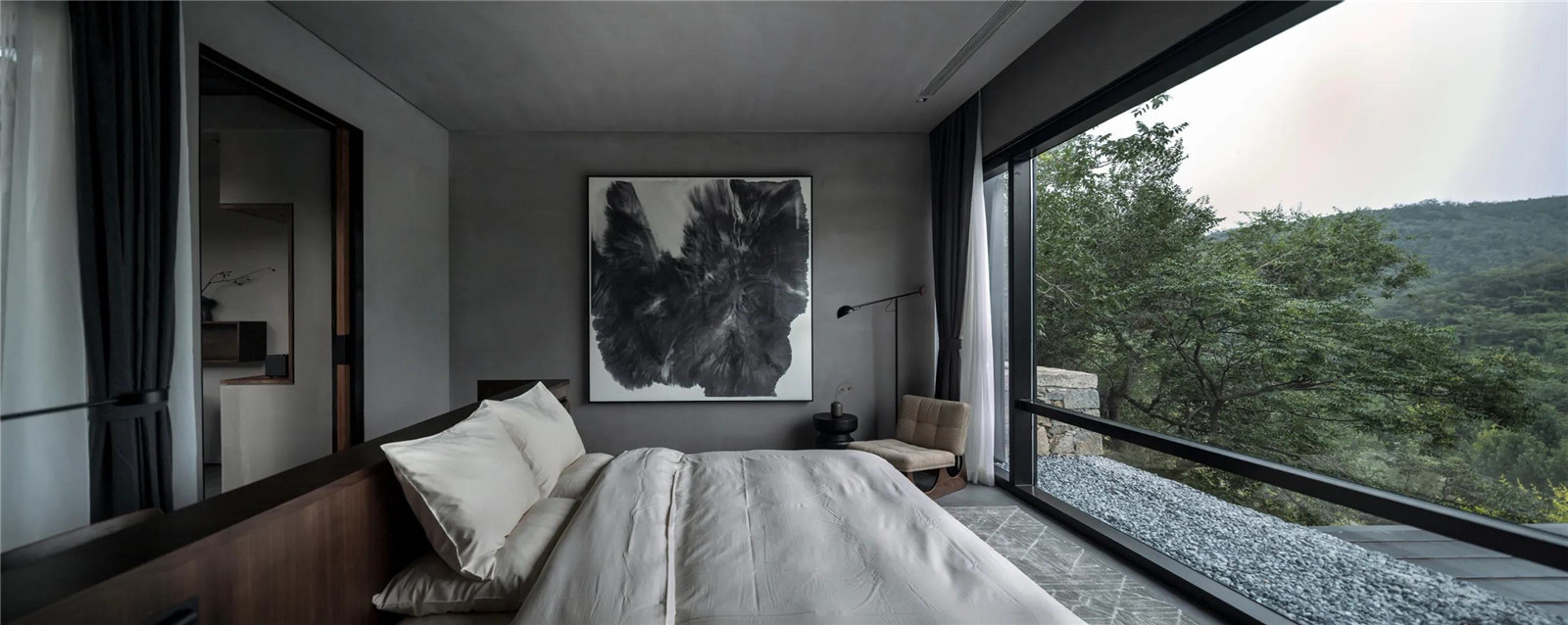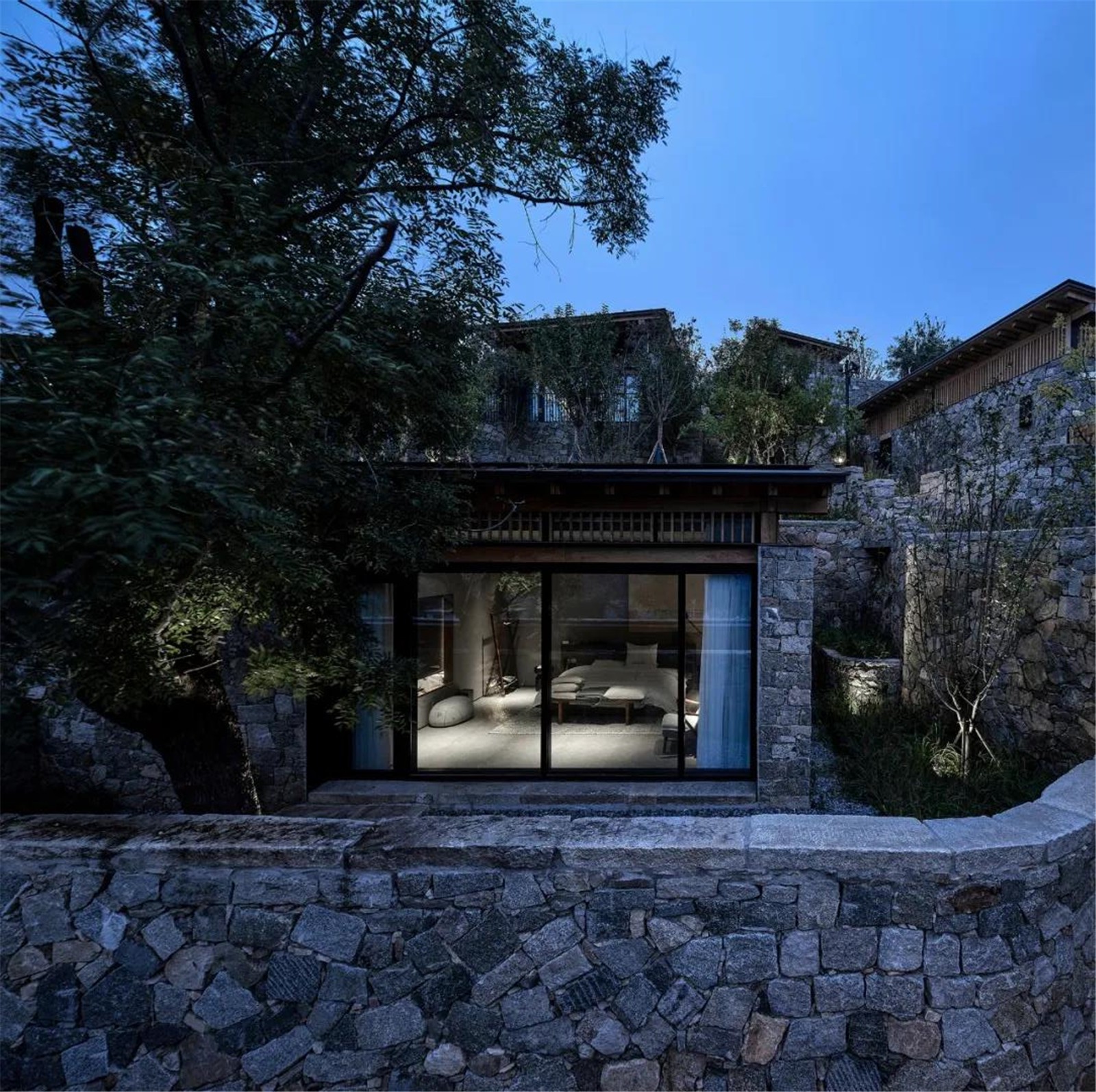 該項(xiàng)目位于泰山九女峰下的東西門村。應(yīng)鄉(xiāng)村振興之策,引入高端民宿。設(shè)計(jì)師抱以對場地的尊重,最小化各類設(shè)計(jì)介入以使場地的氣質(zhì)自然顯露,提供質(zhì)樸而舒適的休憩空間。