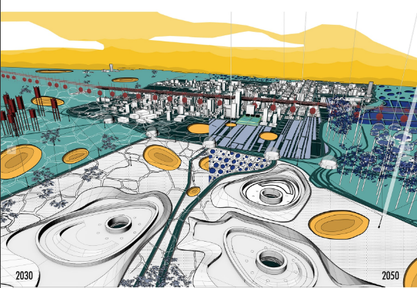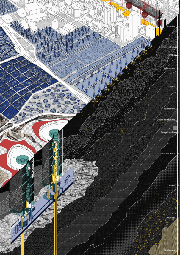 設(shè)計(jì)者以約翰內(nèi)斯堡利用廢棄的金礦建立地下城市為前提,設(shè)計(jì)了一系列地表上用于采集降水的公共設(shè)施,以維持地下城市的運(yùn)行。設(shè)計(jì)還包括了對未來人造景觀和生態(tài)系統(tǒng)的暢想。