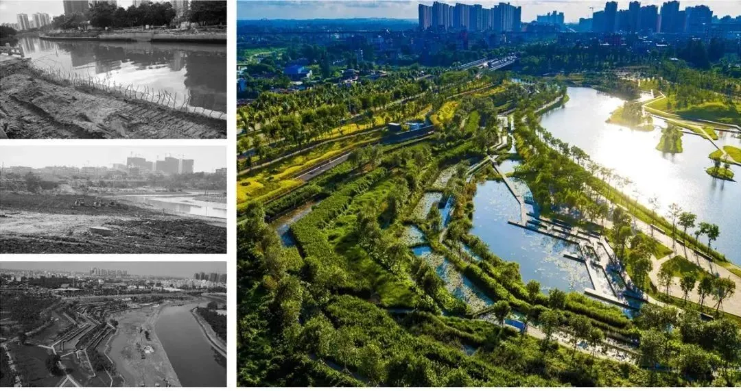 設(shè)計(jì)師科學(xué)的進(jìn)行截污,布置海綿設(shè)施(緩坡草地、雨水邊溝、生態(tài)駁岸擋墻、臺田濕地),在此營造河流密林、濕地、淺灘的河流生境;