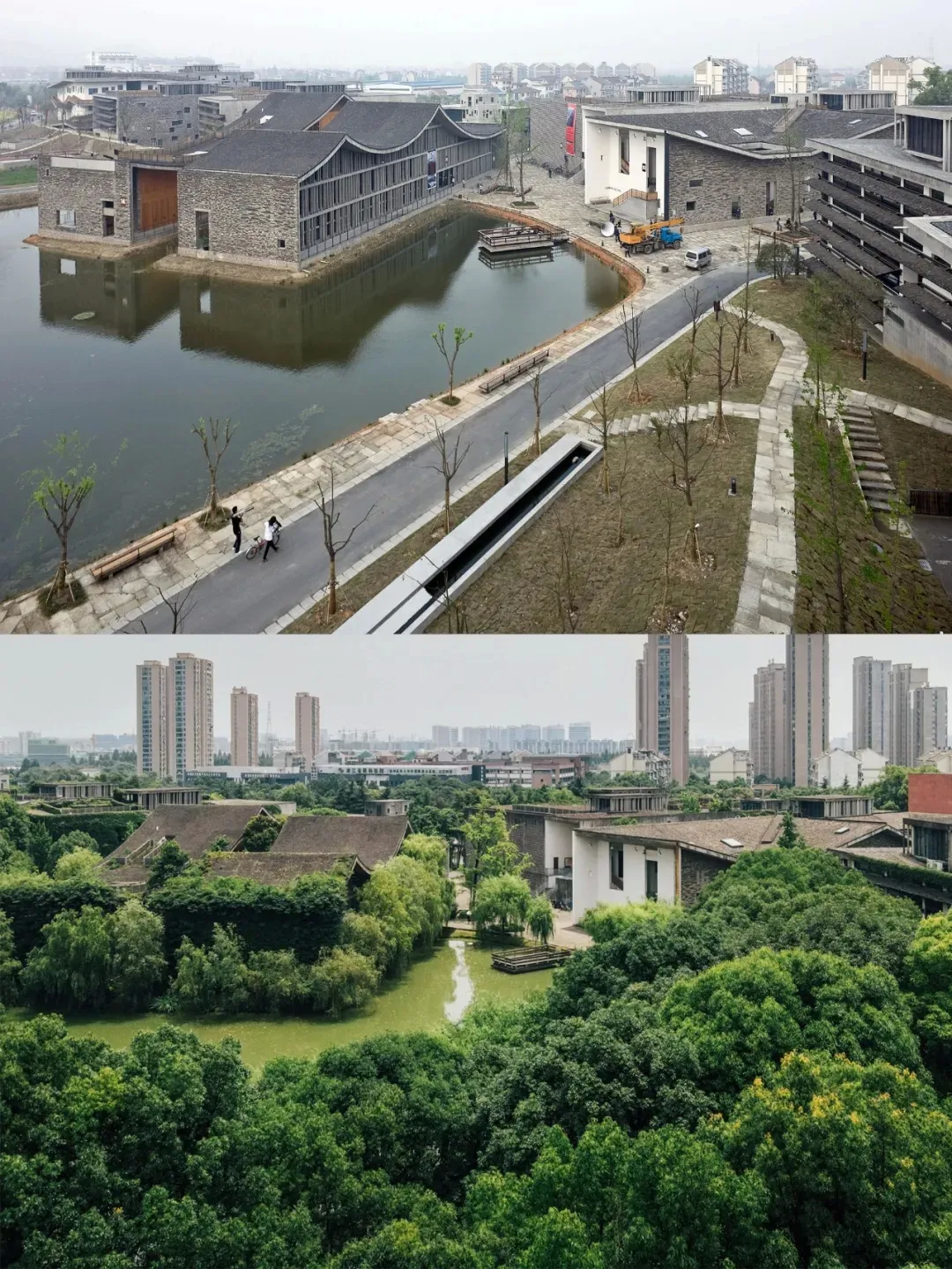 2007年攝影師Iwan Baan曾記錄了竣工后的校園。2021年,攝影師趙賽使用原焦段鏡頭拍攝了同場景的校園照片,十幾年的時間中,綠植覆蓋和遮擋,建筑有了自己的生命??催^這些對比圖,似乎更能理解王澍在《造房子》中的文字:“每一次,我都不只是做一組建筑,每一次,我都是在建造一個世界?!?/p>