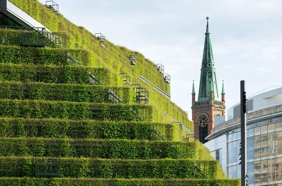 近日,擁有全歐洲面積最大的綠色外墻的K?-Bogen II商業(yè)和辦公綜合體正式完工。大樓高27米,長120米,包括屋頂在內(nèi)的其他幾個立面覆蓋著長達8公里的角樹樹籬和超過3萬棵的綠植。憑借著廣闊的綠色外墻,大樓提供了一種具有前瞻性的、應(yīng)對氣候變化的城市策略。