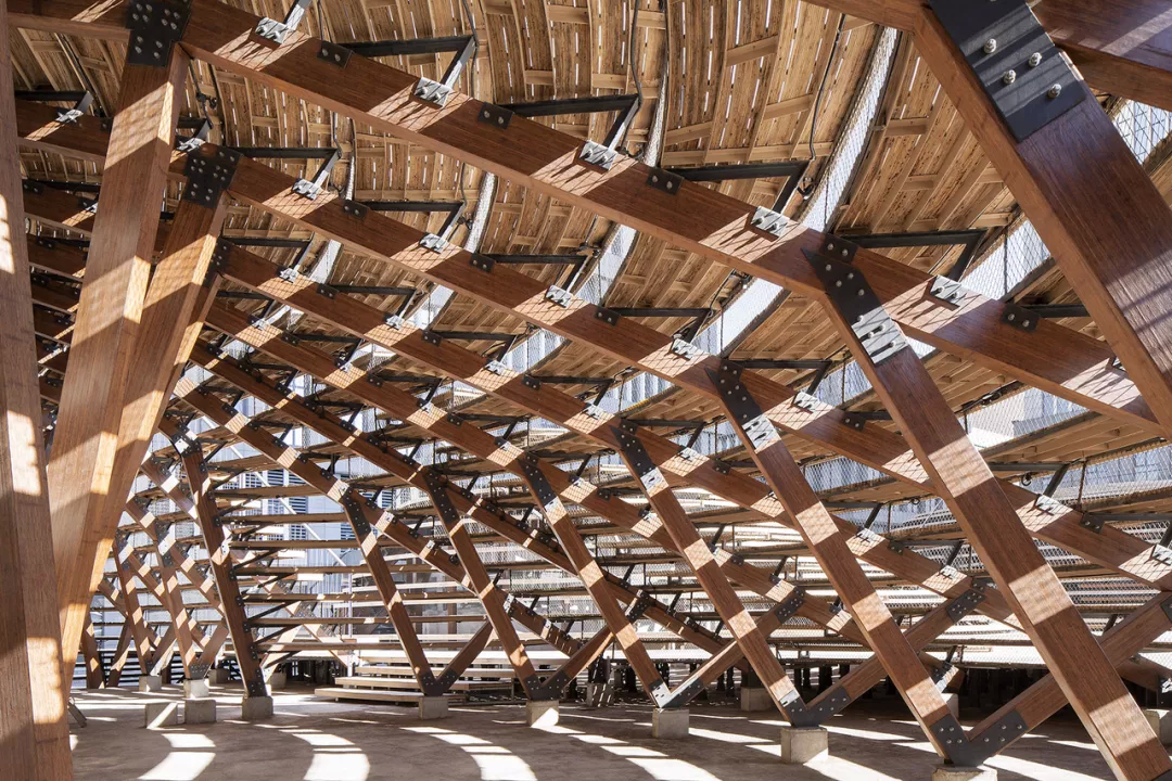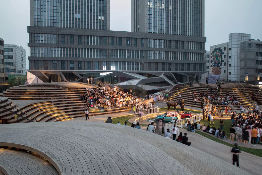 由原地建筑設(shè)計(jì)的山丘廣場(chǎng)坐落于天津智慧山園區(qū),自建成至今的四年間,這片“山丘”承載了諸多公共活動(dòng)與集會(huì)。若論甲方“時(shí)尚生活舞臺(tái)與文化吸引力的城市空間”的訴求,竹之山丘無疑是成功的。設(shè)計(jì)團(tuán)隊(duì)的方案生成也很好的契合了場(chǎng)地,依托于場(chǎng)地現(xiàn)狀的消極構(gòu)筑物,創(chuàng)造出兩層空間:上層空間提供大量可使用界面,滿足活動(dòng)需求;下層形成獨(dú)立展示空間,斑駁光影透過竹條間隙灑下,兼具通透與私密。