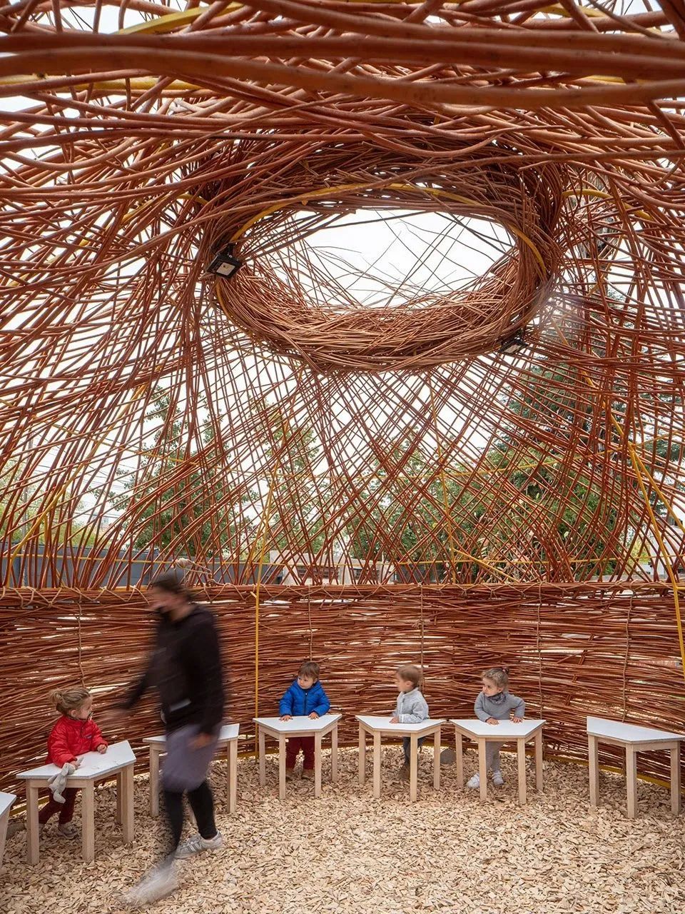 近年來,中國(guó)的“最美幼兒園”層出不窮,而可以孩子們?cè)谀嗤晾锎驖L,重新認(rèn)識(shí)自然的設(shè)計(jì)思路卻鮮有實(shí)踐。在屏幕時(shí)間激增的今天,孩童似乎與親近自然的概念漸行漸遠(yuǎn)。與時(shí)俱進(jìn)的教育空間更需要設(shè)計(jì)師、教育者和使用者合作完成設(shè)計(jì)。(陶宇恒撰)