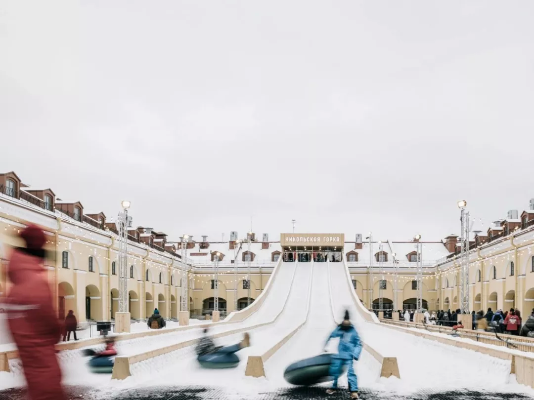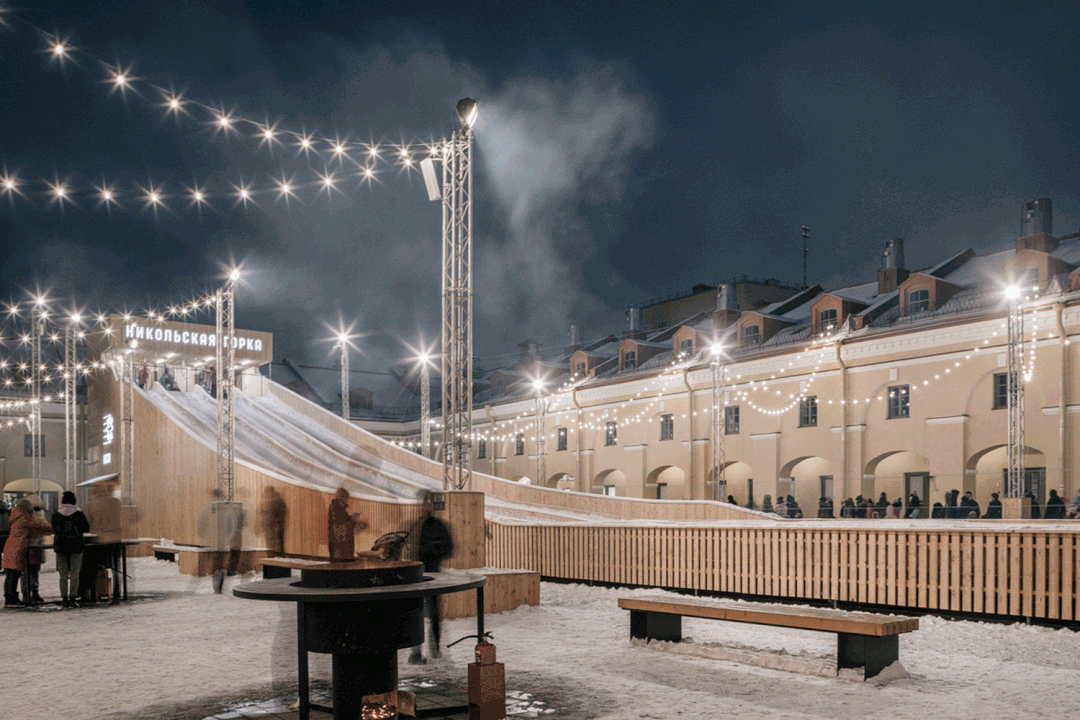 位于俄羅斯圣彼得堡的Nikolsky Rows是一個(gè)極具俄羅斯特色,歷史悠久的購(gòu)物綜合體。近年來,建筑年久失修,逐漸淡出城市的焦點(diǎn)。建筑的所有者終于到邀請(qǐng)KATARSIS ab,將綜合體中心的庭院改造成一個(gè)可以靈活變化的公共空間。該公共空間中的所有裝置都具有臨時(shí)性,可隨時(shí)拆卸重組。這些裝置中最吸引眼球的即是一座滑梯山(Sliding Hill)?;萆奖旧砭褪鞘ケ说帽さ臉?biāo)志性歷史元素之一,在冬季提供了一個(gè)極具童趣的玩樂空間。而在夏季,滑梯山又可以重組為一個(gè)布滿綠植的室外劇場(chǎng),讓市民享受夏日時(shí)光。