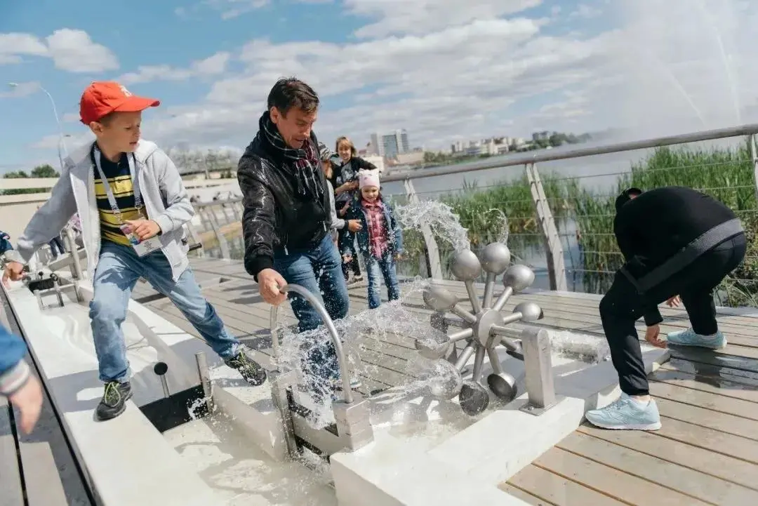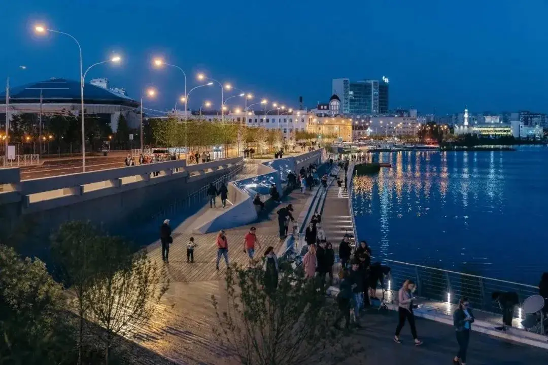 設(shè)計以“彈性飄帶,喀山的不朽瑰寶”為主題,將三個湖泊連在一起,打造連續(xù)的景觀網(wǎng)絡(luò)系統(tǒng),編織出潛力無限的公共空間。在充分結(jié)合場地現(xiàn)狀的基礎(chǔ)上,激活周邊環(huán)境,也加固了場地的生態(tài)系統(tǒng)?!芭c水為友”的設(shè)計理念貫穿始終。