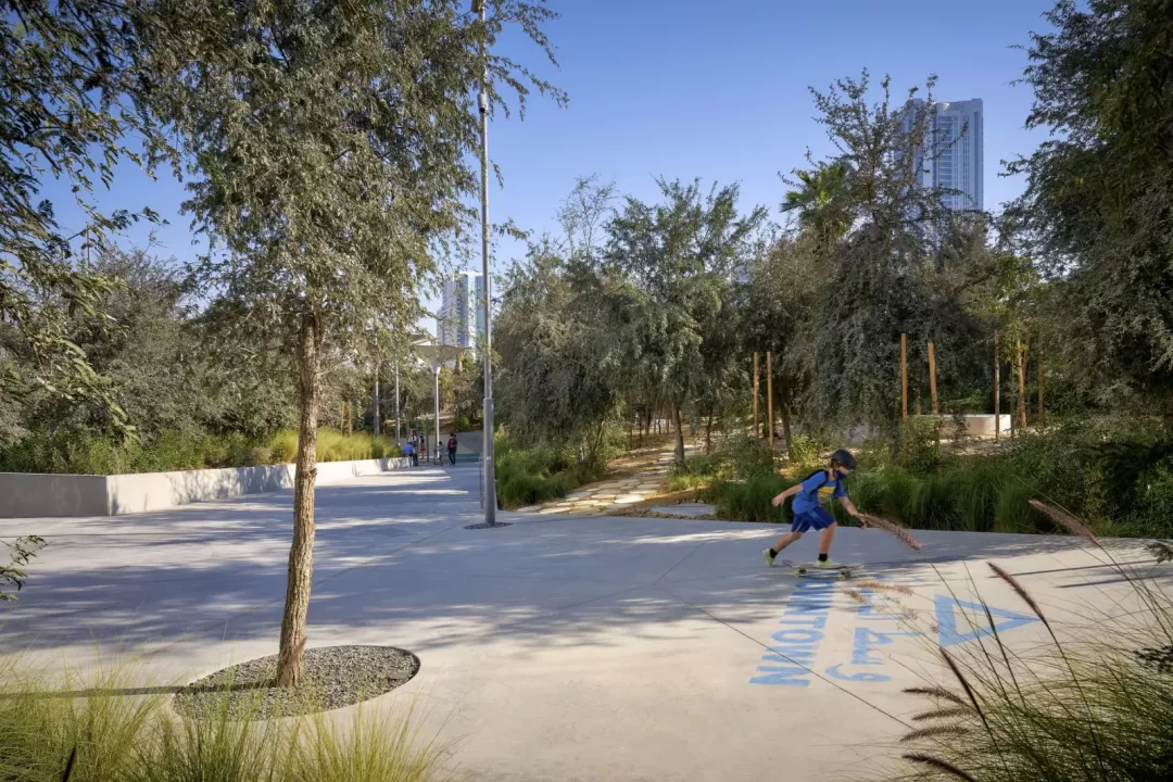 項目通過引入一種獨特的本地城市景觀美學,在阿聯(lián)酋遺產(chǎn)、自然和現(xiàn)代城市生活之間架起橋梁。景觀設(shè)計實施了一系列可持續(xù)的建立在并專門適應(yīng)場地、氣候和文化的基礎(chǔ)上舉措,無縫集成到公園景觀的整體設(shè)計語言中,既是可持續(xù)的城市規(guī)劃工具,也是文化的支柱,從而發(fā)展和振興該地區(qū)的內(nèi)在品質(zhì)。