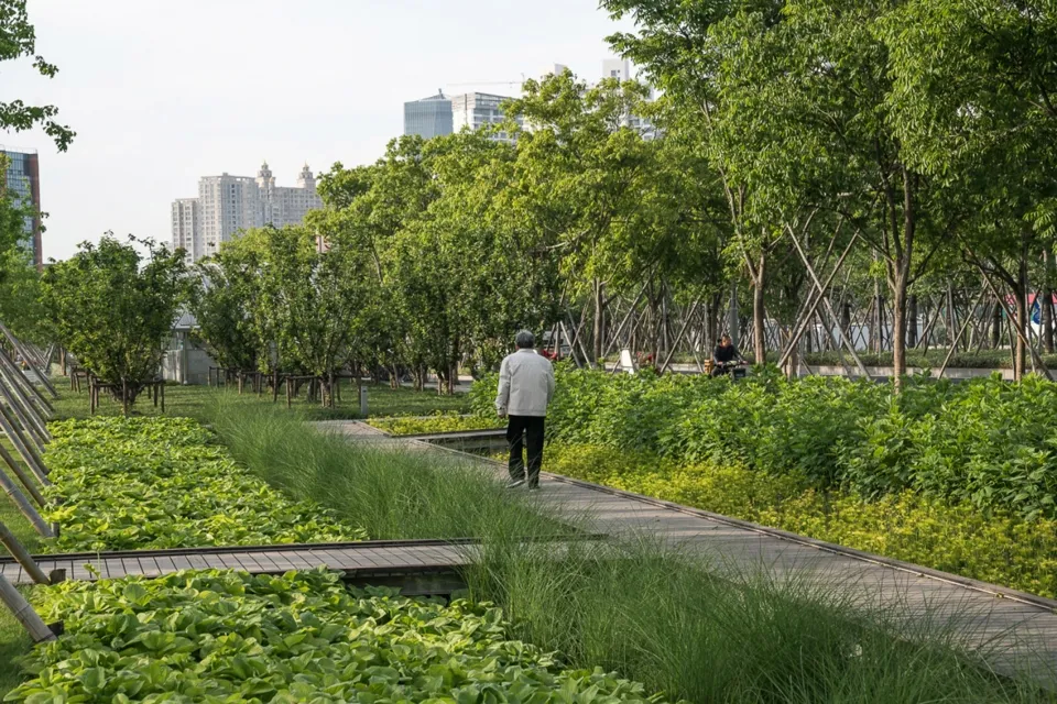 徐匯跑道公園是一個反映上海城市發(fā)展史的創(chuàng)意城市更新項目??紤]到場地的前身是上海龍華機場跑道,公園設(shè)計效仿機場跑道的動態(tài)特質(zhì),采用多樣化的線性空間將街道和公園組織成一個統(tǒng)一的跑道系統(tǒng),滿足汽車、自行車和行人的行進需要,每個空間中采用了不同的材料、尺度、地形,并設(shè)計了不同的活動項目,以創(chuàng)造多樣的空間體驗。