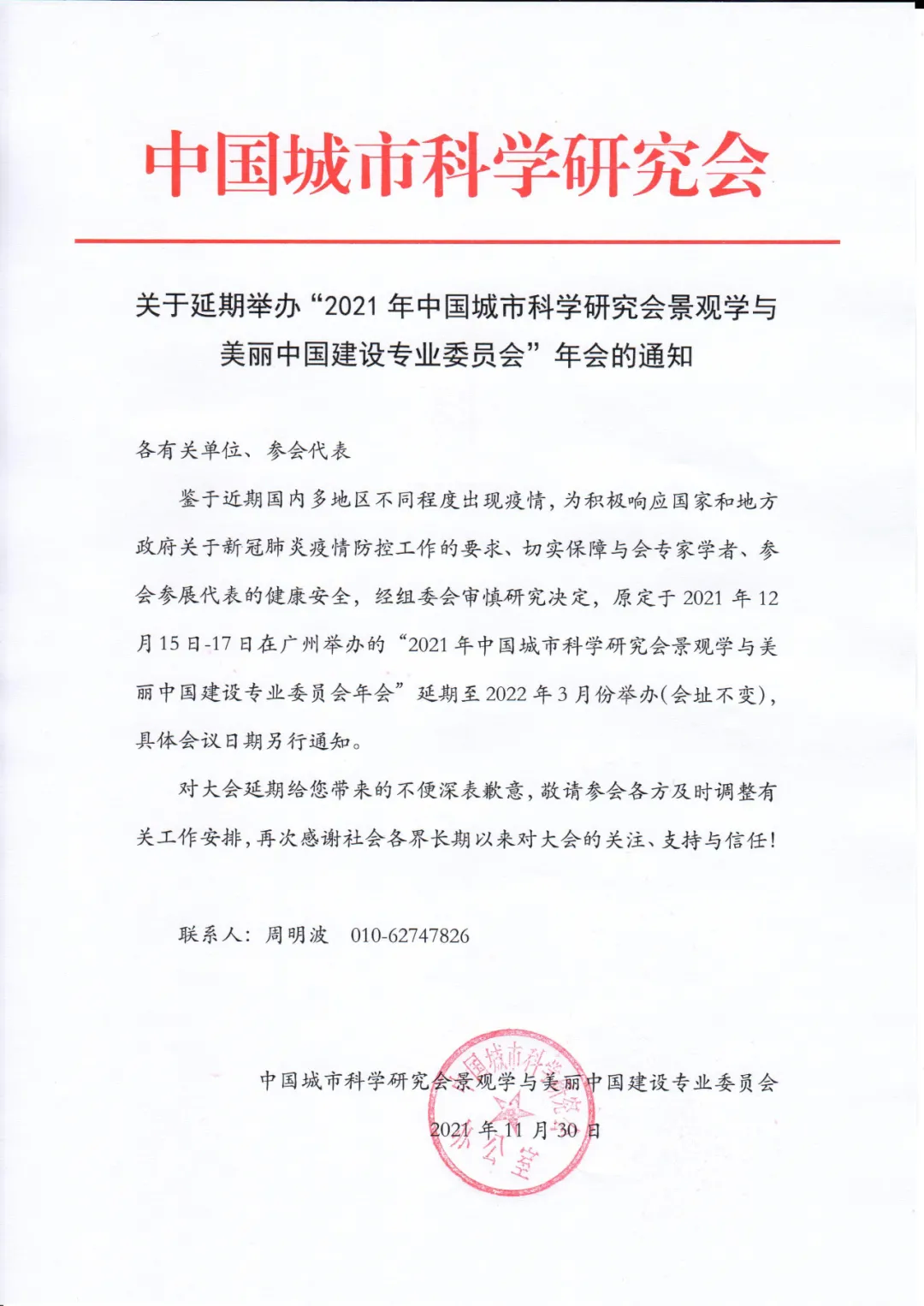 鑒于近期國內(nèi)多地區(qū)不同程度出現(xiàn)疫情,為積極響應(yīng)國家和地方政府關(guān)于新冠肺炎疫情防控工作的要求、切實保障與會專家學(xué)者、參會參展代表的健康安全,經(jīng)組委會審慎研究決定,原定于2021年12月15日-17日在廣州舉辦的“2021年中國城市科學(xué)研究會景觀學(xué)與美麗中國建設(shè)專業(yè)委員會年會”延期至2022年3月舉辦(會址不變),具體會議日期另行通知。