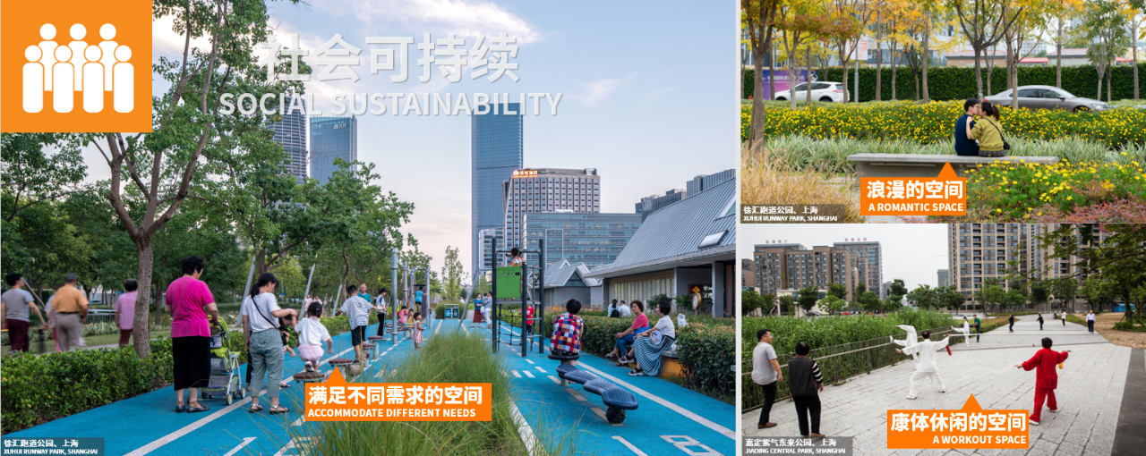 社會因素包含場地需提供服務(wù)于社區(qū)的多元空間,滿足不同人群的平等的使用需求。例如徐匯跑道公園的設(shè)計在滿足不同年齡層次休閑娛樂需求的同時,兼顧了對社會弱勢群體的無障礙活動需求。