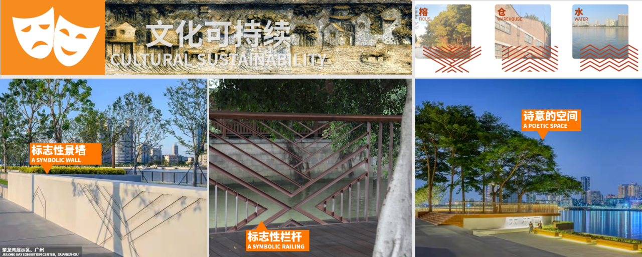 文化因素包含場地基因的充分彰顯和對場所記憶的現(xiàn)代演繹。廣州聚龍灣項目通過提煉場地自身的特色元素,將其抽象符號化地運用在了場地景觀設(shè)計中。