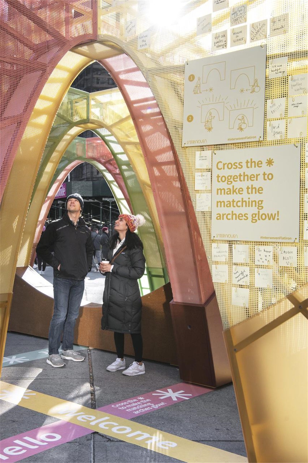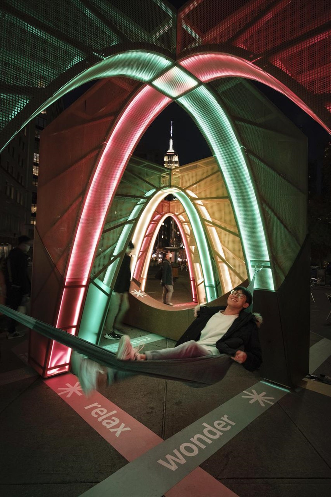 由Cho Thompson事務(wù)所設(shè)計(jì),2021年Flatiron廣場(chǎng)假日設(shè)計(jì)競(jìng)賽的獲勝方案“交織”(Interwoven)在紐約落成。這件公共藝術(shù)裝置作品由相互交叉的拱頂構(gòu)成,一方面呼應(yīng)了Flatiron大廈的建筑形態(tài),另外一方面寓意著美國(guó)斑斕的文化交織。當(dāng)人們穿過(guò)這個(gè)藝術(shù)裝置的時(shí)候,會(huì)伴隨著與其動(dòng)作同步的燈光與為該裝置創(chuàng)作原創(chuàng)音樂(lè),讓游客進(jìn)一步感受到文化與體感交織。裝置的其中一個(gè)部分是互動(dòng)的故事墻,鼓勵(lì)游客相互分享有趣的想法,同時(shí)也映射著紐約包容與多樣的精神。(馮康泰撰)