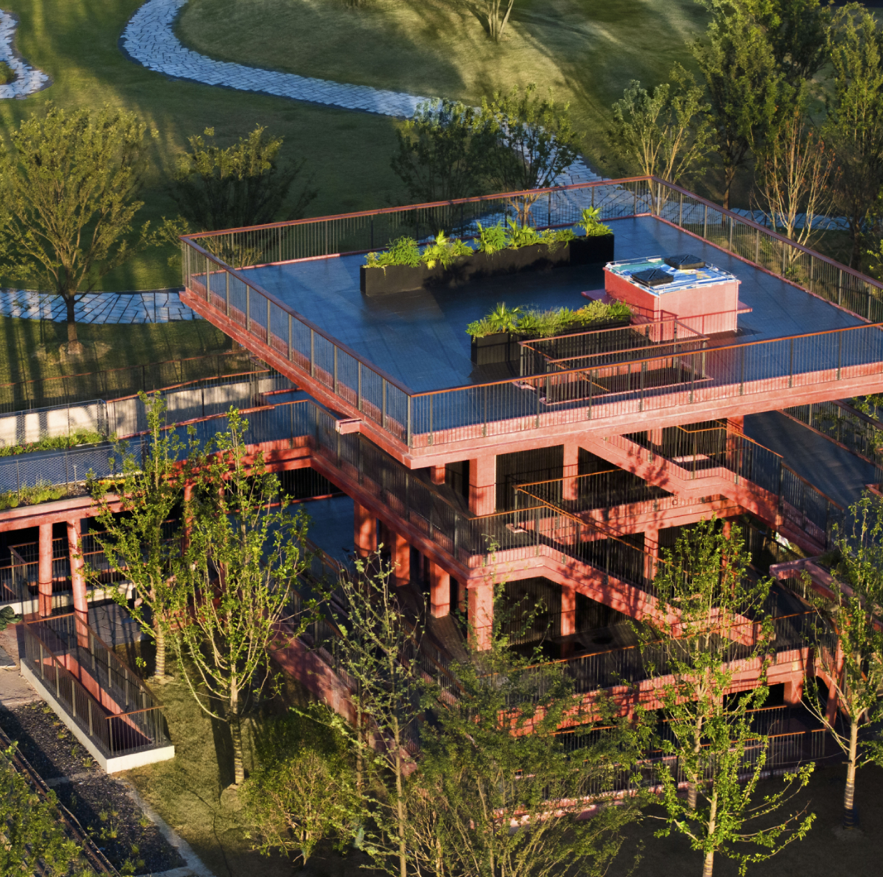 設(shè)計(jì)希望在創(chuàng)新性保留工業(yè)遺存的同時(shí),體現(xiàn)江南的地域特征,在馬嶺山和杭鋼湖之間形成富有變化的當(dāng)代活力景觀,成為杭州市獨(dú)特的文化地標(biāo)。設(shè)計(jì)打造了一系列與遺存建筑相得益彰的“新系統(tǒng)”構(gòu)筑物,它們以“板柱”為基本元素,以銹紅混凝土為基本材質(zhì),弱化了體量。“新系統(tǒng)”環(huán)繞場(chǎng)地中心補(bǔ)足功能,有效地組織了空間結(jié)構(gòu),同時(shí)也作為一條“趣味路線”,串聯(lián)眾多景觀節(jié)點(diǎn),衍生出廊、橋、臺(tái)等豐富公共空間。