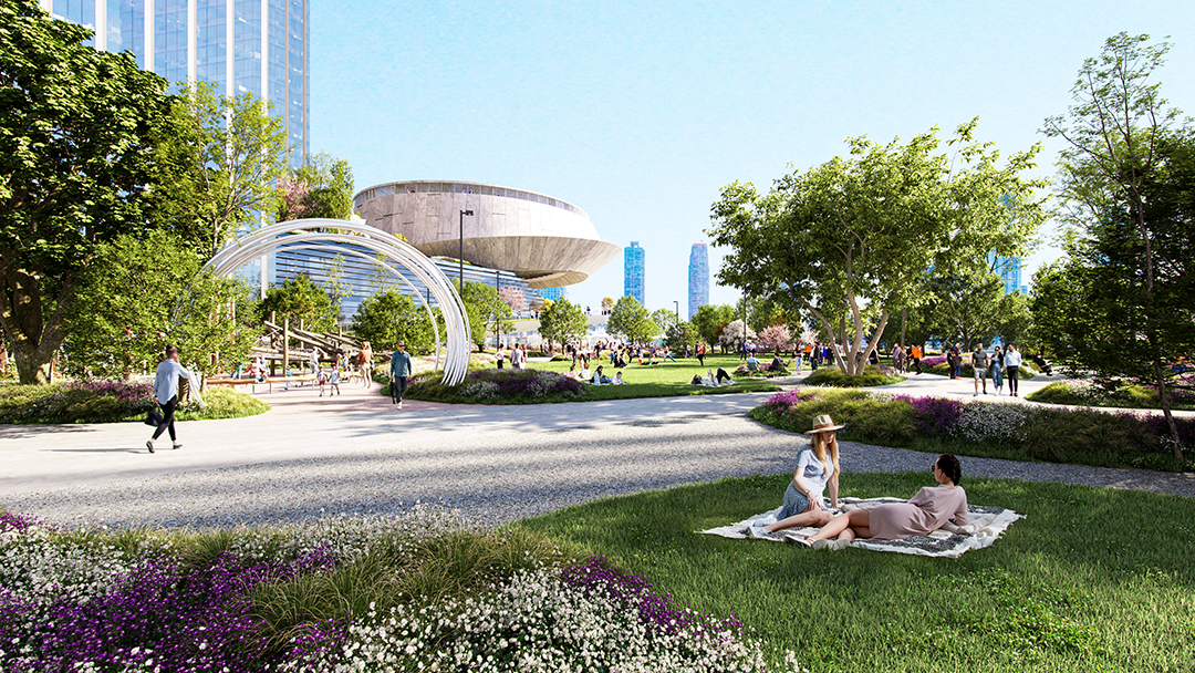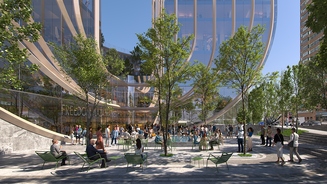 自由廣場中的建筑布局延續(xù)了曼哈頓正交網(wǎng)格狀的城市肌理,既尊重了北側(cè)著名的聯(lián)合國建筑群,又為濱水區(qū)增添了有趣的雕塑元素。設(shè)計(jì)將三處城市街區(qū)連接起來,將景觀一直延伸至河邊。綠地空間包括兒童游樂區(qū)、寵物活動(dòng)區(qū)、表演舞臺、活動(dòng)草坪、美食集市等豐富活動(dòng)區(qū),將藝術(shù)、娛樂、文化和自然融為一體。設(shè)計(jì)采用本土植物和適應(yīng)氣候的物種,為傳粉昆蟲提供食物和棲息地。蜿蜒的懸空步道連接一系列室外花園,為城市提供了一片綠洲,人們可以在享受愜意的同時(shí),觀賞壯麗的城市景觀。