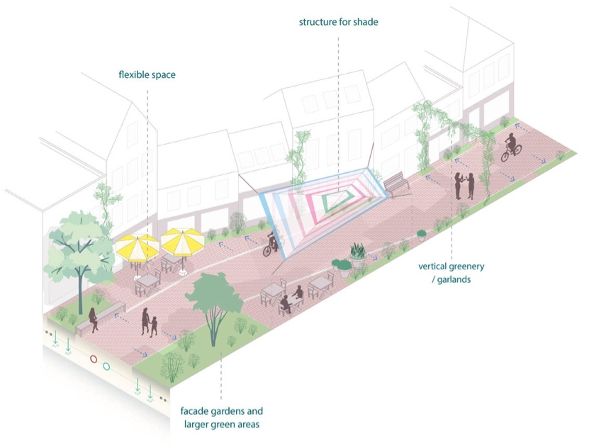本次規(guī)劃將通過(guò)綠蔭路線串聯(lián)景觀節(jié)點(diǎn),構(gòu)建一個(gè)連貫的綠化空間,從而形成“冷卻網(wǎng)絡(luò)”,旨在提升城市中心的氣候適應(yīng)性和街區(qū)形象。設(shè)計(jì)重新定義了"阿納姆風(fēng)格",利用紅色燒磚、生態(tài)環(huán)境、無(wú)障礙設(shè)施、創(chuàng)意產(chǎn)業(yè)這四大元素,打造風(fēng)格統(tǒng)一的綠蔭街道、秘密花園、綠色屋頂、戲水池特色景觀等,并為城市未來(lái)的種植、鋪裝,以及如何合理應(yīng)用設(shè)計(jì)元素提供了明確指導(dǎo)。