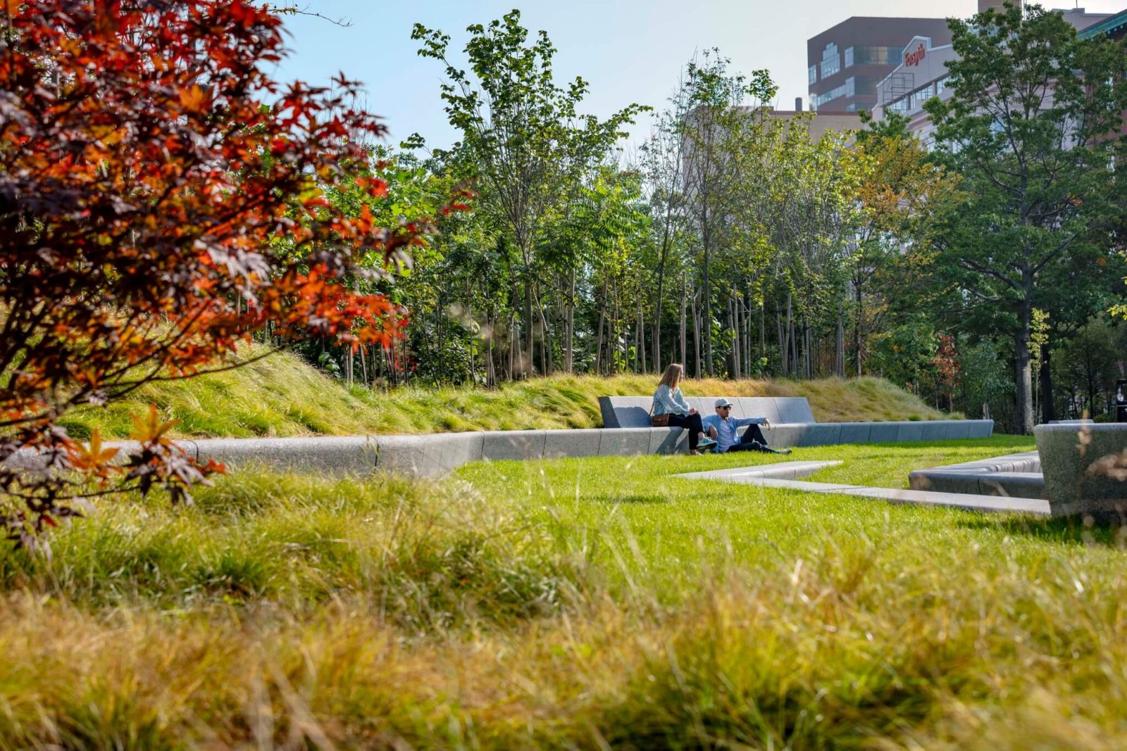 除了提供公共開放空間,該公園還是劍橋城市林業(yè)部門的示范項(xiàng)目,在注重城市森林規(guī)模的同時(shí),強(qiáng)調(diào)森林的健康和生態(tài)恢復(fù)能力。受新英格蘭原生植物群落的啟發(fā),公園被劃分為三個(gè)生境區(qū):低地森林、高地森林和中地森林。低地森林是公園的天然低點(diǎn),由于雨水徑流匯集,這里生長著許多耐濕樹種;高地森林則利用數(shù)百棵種植在護(hù)堤上的植物,形成生態(tài)緩沖區(qū),進(jìn)而保護(hù)位于場(chǎng)地中央的社交區(qū)域。