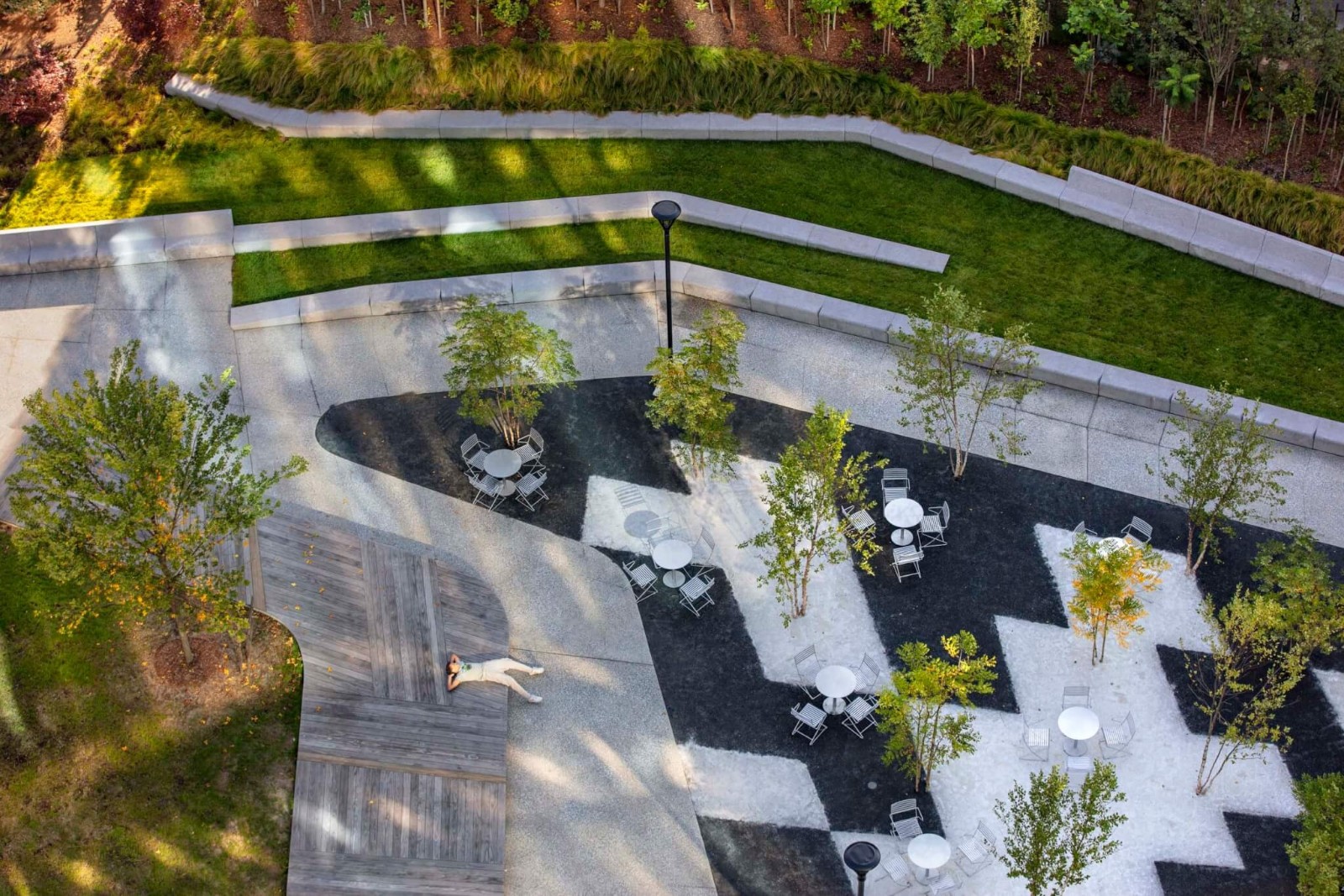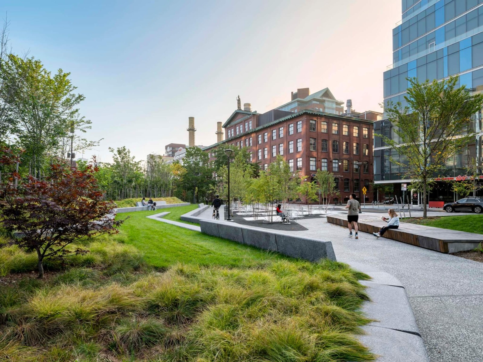 日前,Stoss Landscape Urbanism設(shè)計(jì)工作室新作——美國馬薩諸塞州劍橋三角公園(Triangle Park)建成細(xì)節(jié)公布。公園位于肯德爾廣場(chǎng)(Kendall Square),被三條城市道路、公寓樓和綜合體建筑所包圍,缺乏植被空間。項(xiàng)目引入了一片包含400余株新植物的“實(shí)驗(yàn)森林”,以增加樹冠覆蓋范圍、應(yīng)對(duì)城市日漸嚴(yán)峻的氣候變化挑戰(zhàn),并打造了遮陽座位區(qū)、傾斜草坪、木制舞臺(tái)等自然愜意的景觀節(jié)點(diǎn)。