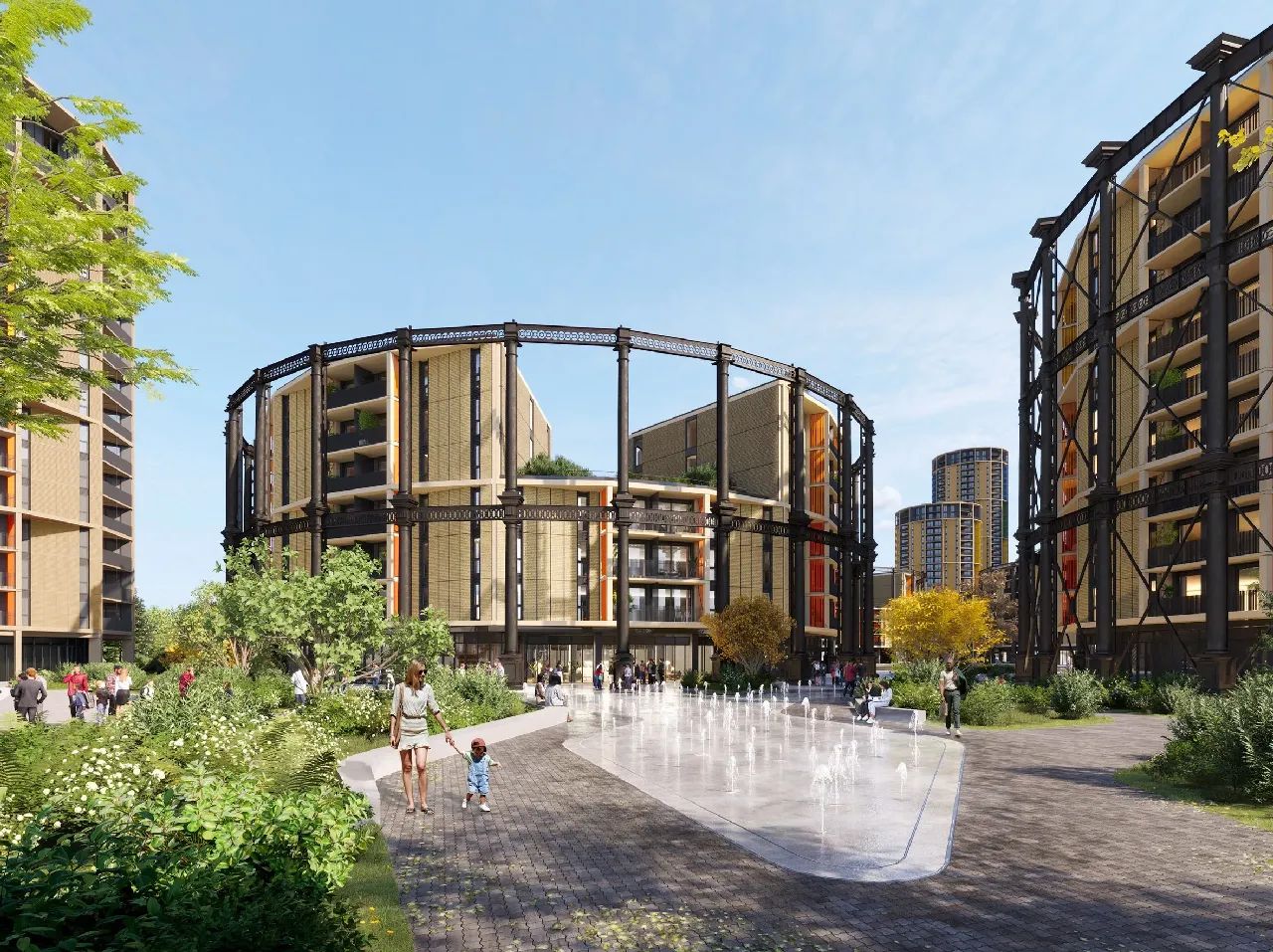 建筑的形式和材料受到原始煤氣罐結(jié)構(gòu)的啟發(fā),保留了基本輪廓,并在立面上呈現(xiàn)出多變的色彩。此外,項(xiàng)目還規(guī)劃了可靈活使用的商業(yè)和社區(qū)空間,包括公共開放空間和新的河濱公園。一處煤氣罐遺址被改造為中央水景,同時(shí)部分煤氣罐將作為社區(qū)中心,容納各種鄰里活動(dòng),并通過(guò)人行道和自行車道與河濱公園相連。