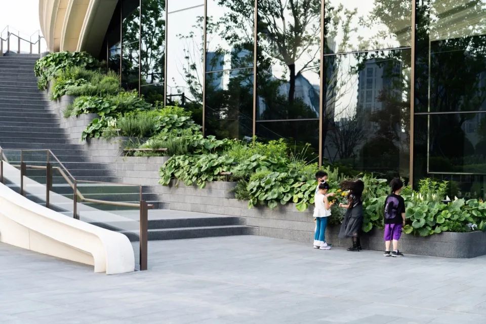 其中,“許愿漩”落客區(qū)采用了與建筑相同的螺旋式設計形式。水流從建筑中心涌出,沿著與建筑相呼應的水道順勢流下。設計特別利用流體模擬對石材進行CNC雕刻,并用3D打印指導施工落地?!靶强昭邸蔽蓓敾▓@結合兩個建筑拱門形成眺望平臺,位于中心的500m2的開敞草坪為藝展和宴會活動提供場地?!颁龌A”作為場地中重要的引導空間、緩沖平臺空間和微氣候綠色空間,設計突破了景觀與臺階及幕墻結構的銜接、覆土荷載、排水等技術難點,構建了每一層規(guī)格各不相同的種植池,劃分了“木秀之林、繁花之野、茂葉之森、銀芒之濱、時空之拱”五大植物空間主題。