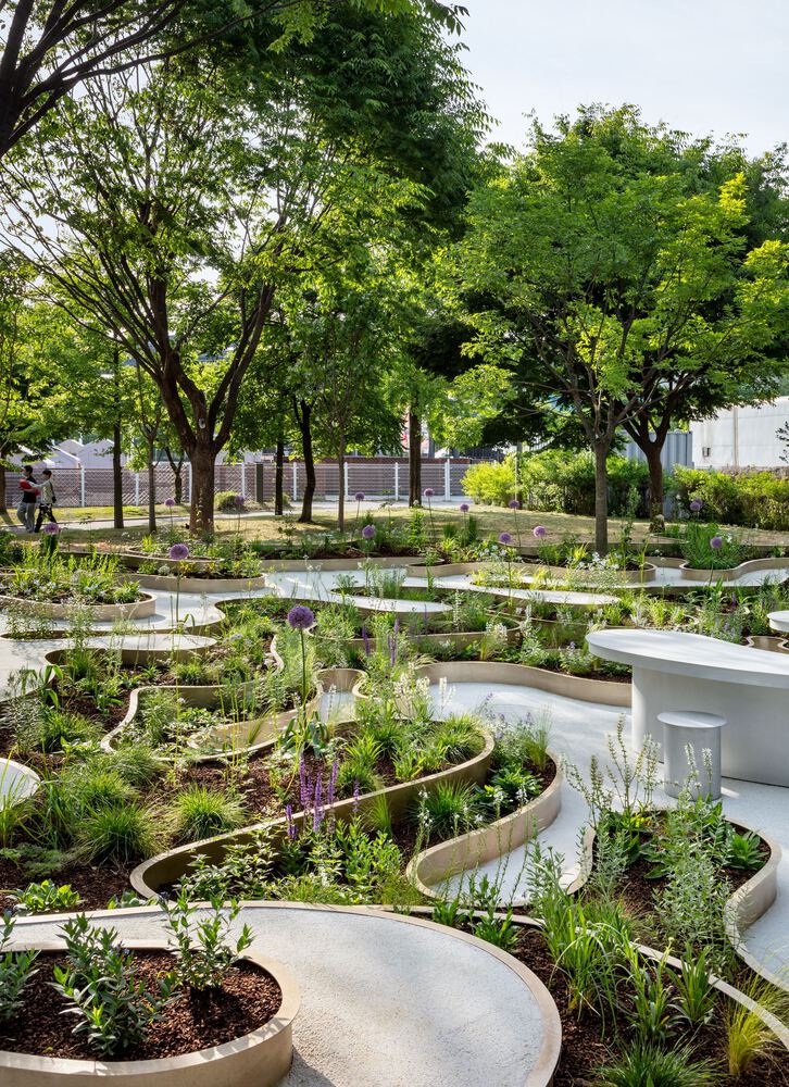 花園在有效提升公眾參與度的同時,提供了一處遠離生活壓力的寧靜之地,在這里人們可以全方位沉浸在自然的懷抱之中。設(shè)計從蜜蜂、甲蟲、蝴蝶等昆蟲與自然環(huán)境的生動互動中汲取靈感,構(gòu)建了多層次的私密空間,將多年生植物和草地融入其中,在花木顏色、景觀紋理和結(jié)構(gòu)上呈現(xiàn)出不斷的變化。通過選擇多年生植物品種,花園無需人工灌溉即可提供四季分明的季相景觀,進而促進自我維持的可持續(xù)性,創(chuàng)造更健康的小氣候。