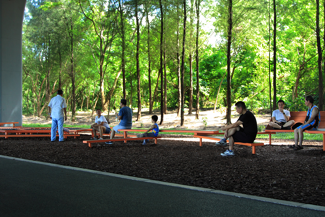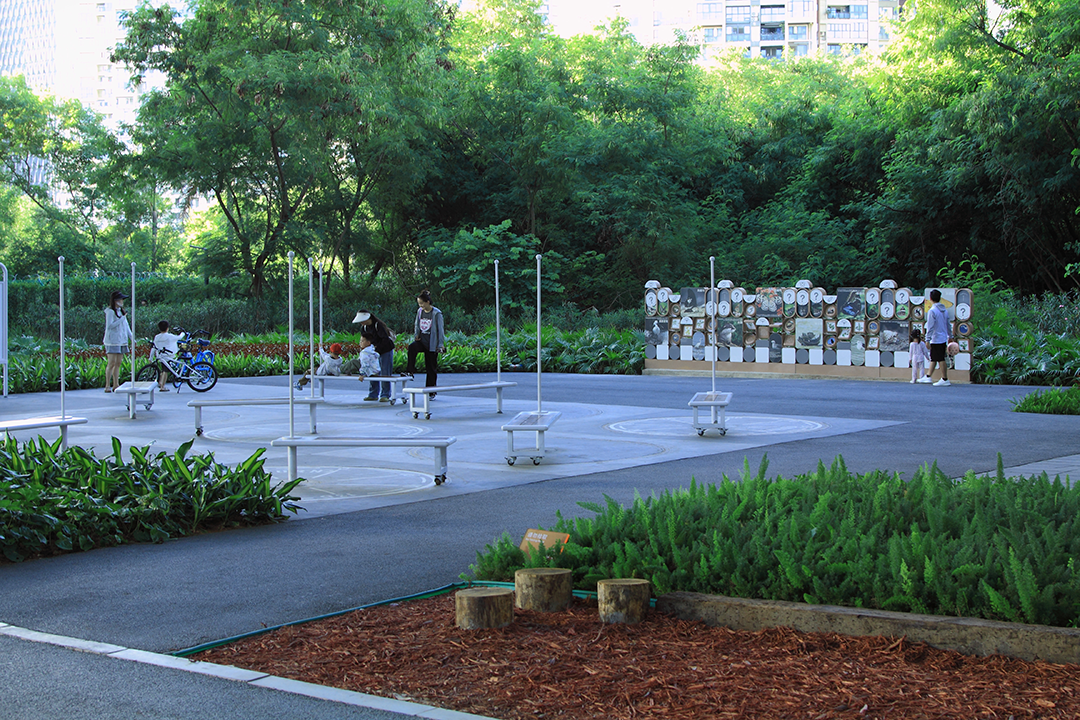 設(shè)計(jì)以打造“‘山海連城’濱海藍(lán)帶獨(dú)特魅力段”“全天候全年齡友好的運(yùn)動(dòng)公園”為目標(biāo),在保證安全的前提下,利用橋下柱廊空間增設(shè)不同寬度的慢行道,結(jié)合河道、海灣、紅樹(shù)林等周邊自然元素,形成三條活力、共享、愜意的線性長(zhǎng)廊。同時(shí),設(shè)計(jì)打造了“歡樂(lè)市集、沐風(fēng)河口、籃球聚場(chǎng)、跳跳樂(lè)園、綠野漫道”五處市民可以集聚活動(dòng)的景觀節(jié)點(diǎn),并置入一系列藝術(shù)裝置和創(chuàng)意空間,鼓勵(lì)市民之間的交流互動(dòng),連接城市生活與自然生態(tài)資源。此外,場(chǎng)地的建設(shè)使用了大量枕木、樹(shù)枝、樹(shù)皮、礫石、海沙、骨料等回收再利用材料。設(shè)計(jì)團(tuán)隊(duì)積極探索低成本開(kāi)發(fā)模式,引導(dǎo)市民和游客了解低碳理念、踐行低碳生活。