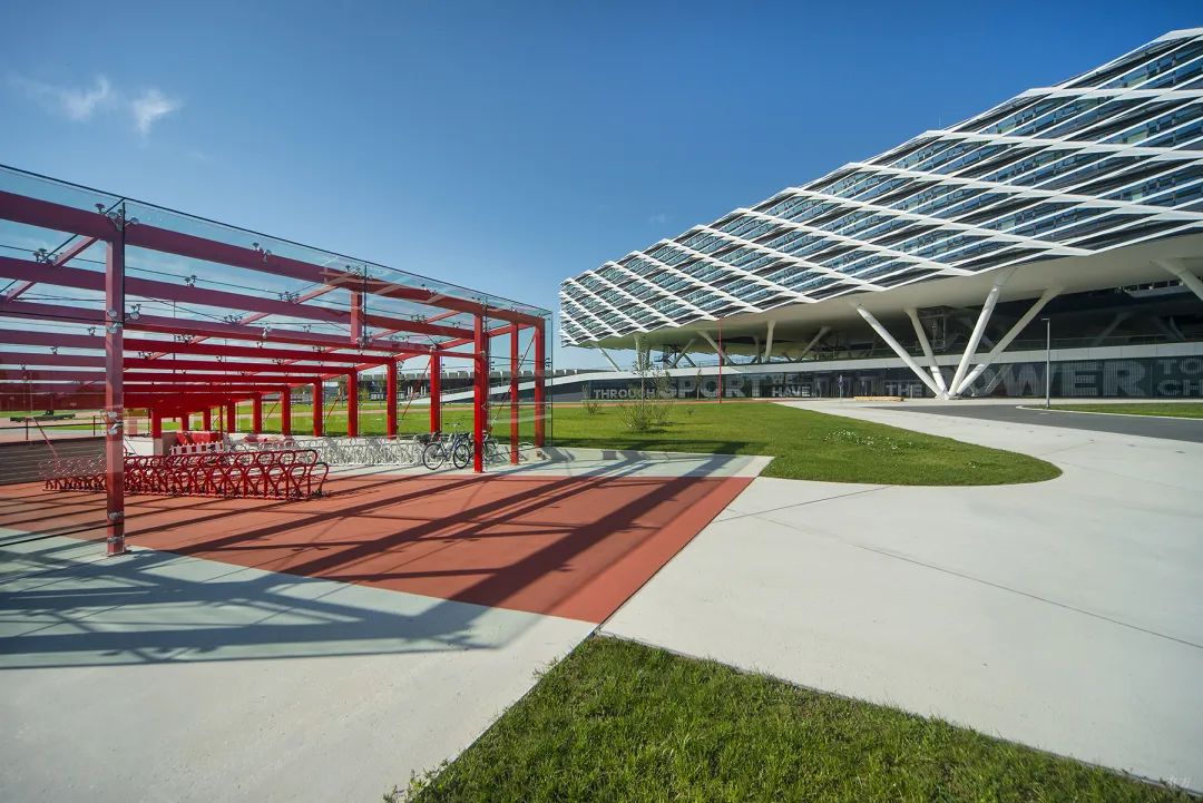 設計以色彩鮮艷的星形公共空間和蜿蜒的新湖泊,為這個“體育世界”提供了一個新鮮和面向未來的標識。整個園區(qū)的設計關鍵是四個獨立的“星星”,它們將園區(qū)各功能區(qū)連接到一起,作為景觀連接紐帶的同時,也為員工提供了聚會和活動的場所。從紅色“星星”區(qū)域開始,游客可以通過名人步道和名人雕像深入體驗阿迪達斯的運動文化。此外,星形區(qū)域周圍分布著自行車棚架和各種運動設施,包括足球場、曲棍球球場、滑板公園和蹦床等,展現(xiàn)了品牌多元化的運動項目。這些戶外運動項目分為永久區(qū)域和臨時活動,更大程度地探索了在場地內進行不同活動的可能性。