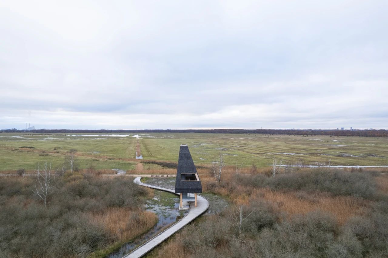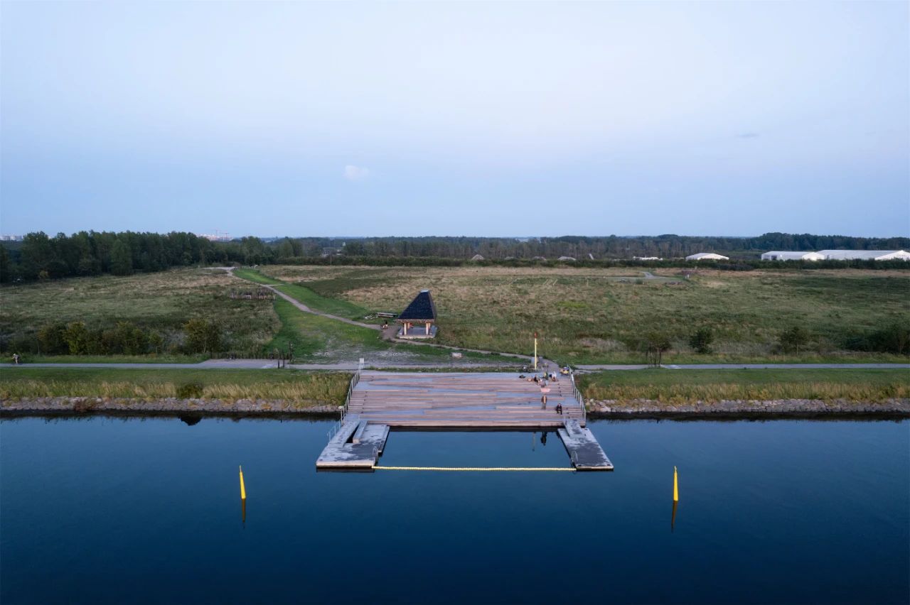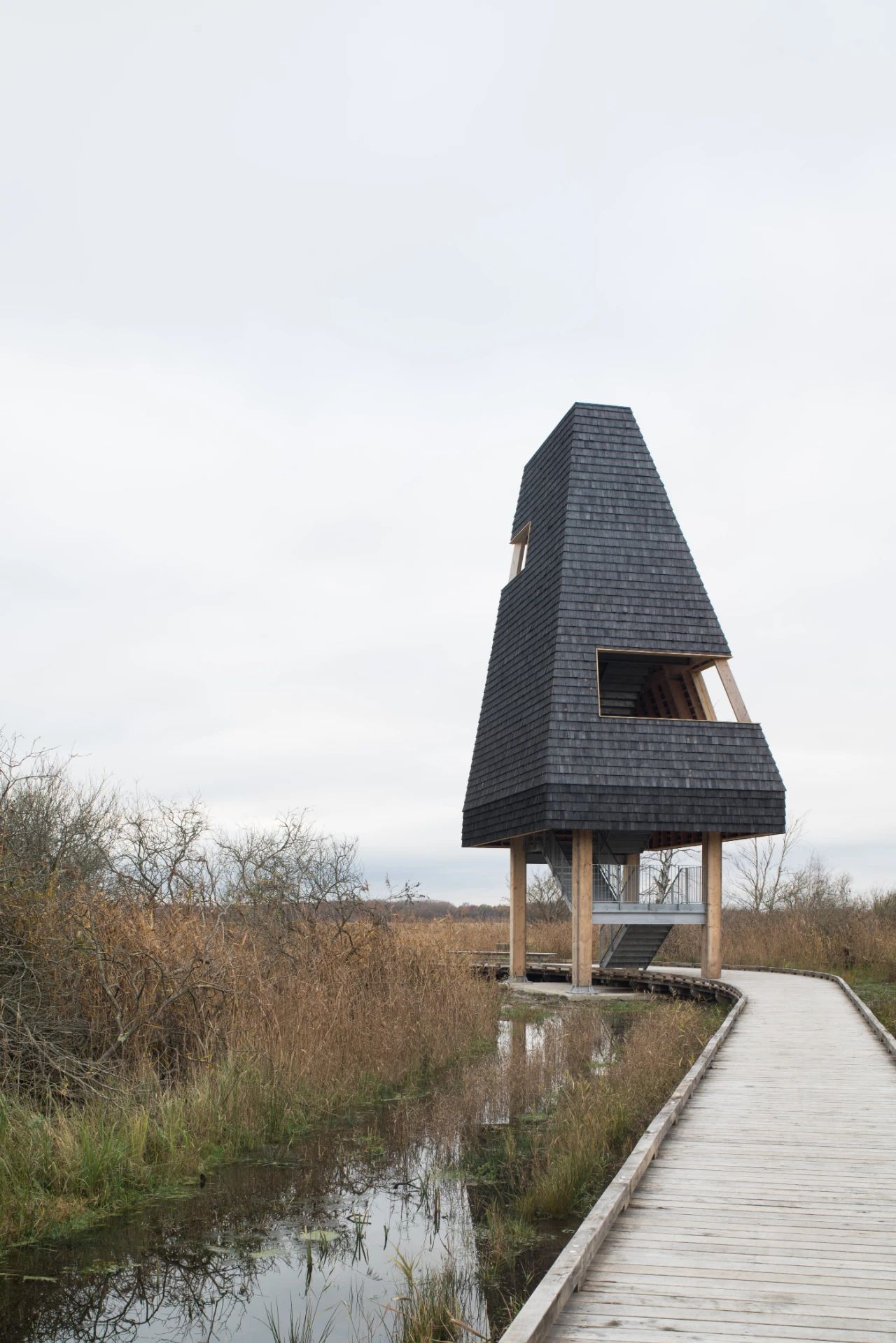 已建成的游客參觀點(diǎn)分布在公園各處,位于從城市到自然或從陸地到水域的過渡地帶,促進(jìn)了人與自然、建筑與景觀之間的交匯。游客參觀點(diǎn)內(nèi)的每座單體建筑的設(shè)計采用了相同的設(shè)計語言,包括明顯的木質(zhì)結(jié)構(gòu)、獨(dú)特的屋頂形狀和深色的瓦片材料,具有統(tǒng)一的標(biāo)識性。設(shè)計將大尺度的景觀分解為游客的活動場所和敘事體驗(yàn),為游客提供了娛樂、自然體驗(yàn)、游戲和學(xué)習(xí)的機(jī)會。