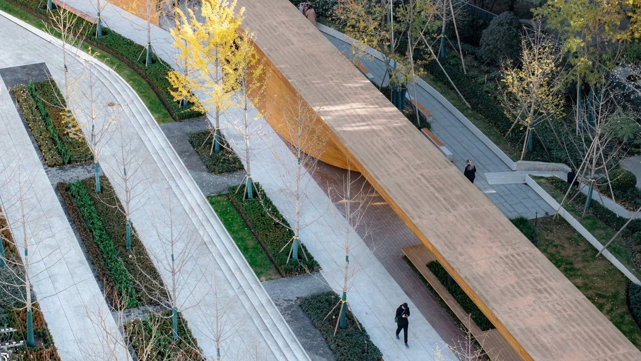 設(shè)計(jì)將寬度適宜的慢行道引入場(chǎng)地,沿城市道路界面結(jié)合行道樹(shù)打造連續(xù)的綠色空間,提升周邊居民的通勤步行體驗(yàn),并提供自然愜意的停留休憩場(chǎng)所。其中,“清風(fēng)驛站”景觀節(jié)點(diǎn)以“廊亭”的方式可為行人遮陽(yáng)避雨,其東側(cè)部分是用于公共閱讀、社區(qū)共享的市民驛站,內(nèi)部結(jié)合建筑結(jié)構(gòu)形成了臺(tái)階式座席,引導(dǎo)人們?cè)诖碎_(kāi)展社交活動(dòng)。同時(shí),“清風(fēng)驛站”還起到劃分口袋公園不同空間氛圍的作用:驛站以北是面向城市開(kāi)放空間的綠地公園,以南則是較為安靜的社區(qū)花園。