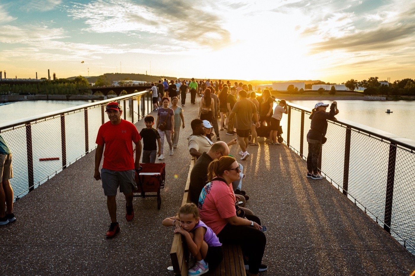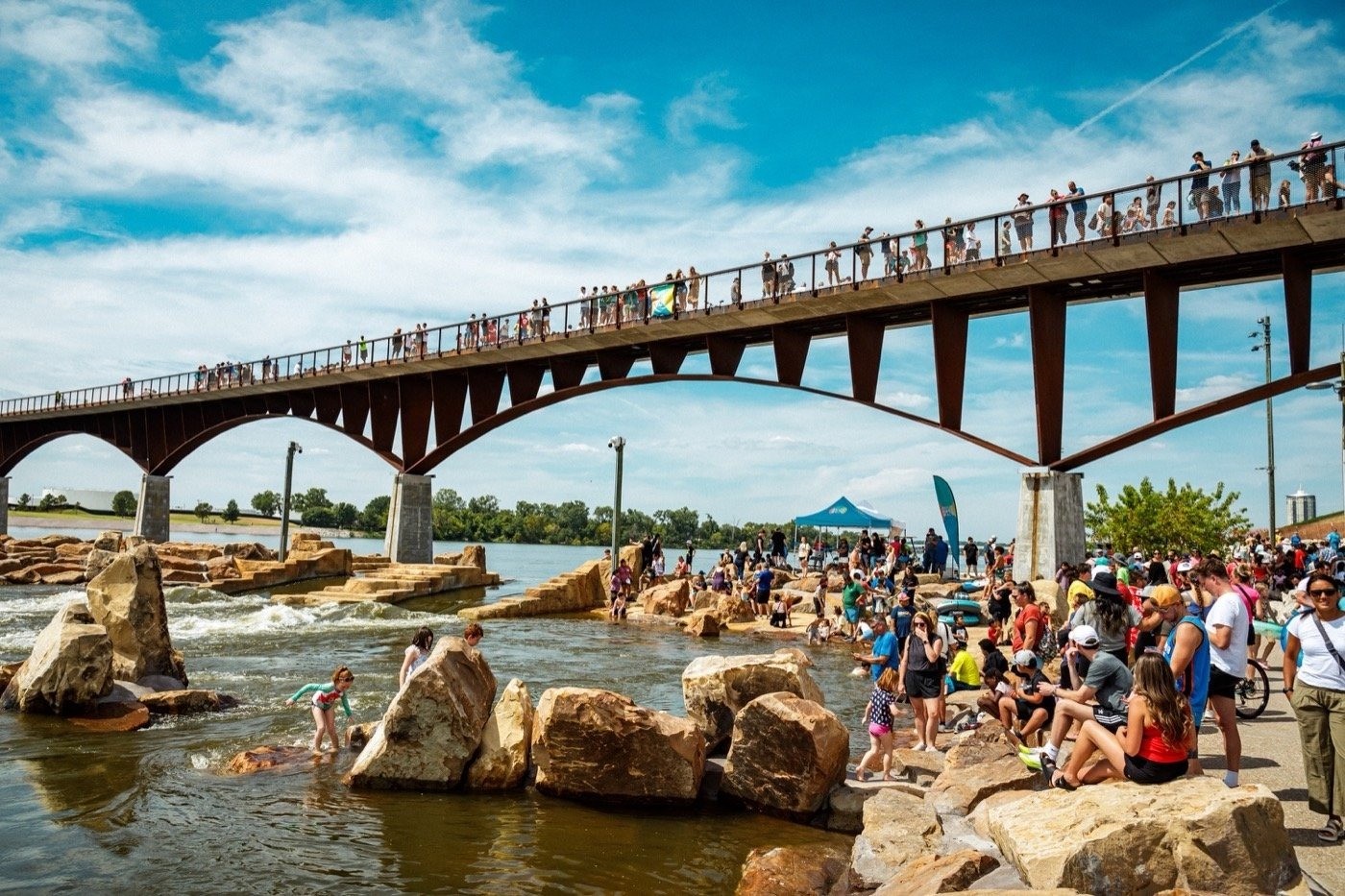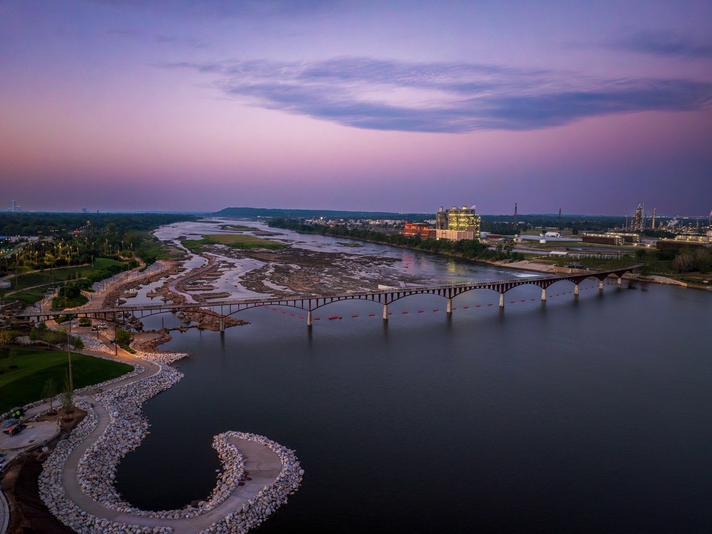 大橋的橋面呈弧形設(shè)計(jì),設(shè)有座椅和觀景臺(tái),讓人們有機(jī)會(huì)駐足欣賞壯麗的河景。為了改善河流的自然水文狀況,橋墩的總占地面積與現(xiàn)有橋梁相比大幅縮小,并致力于提高大橋在未來(lái)應(yīng)對(duì)更頻繁的洪水災(zāi)害的抵御能力。同時(shí),設(shè)計(jì)新增了休閑區(qū)大壩“津克湖”(Zink Lake)、濱水觀景步道及新的步道連接點(diǎn),以及一處濱水公園等城市景觀設(shè)施和公共場(chǎng)所。此外,MVVA與McLaughlin Whitewater設(shè)計(jì)集團(tuán)合作打造了一條沿河邊長(zhǎng)達(dá)335m的戲水渠,用于皮劃艇、沖浪和漂流,吸引了大量周邊居民在此游玩。