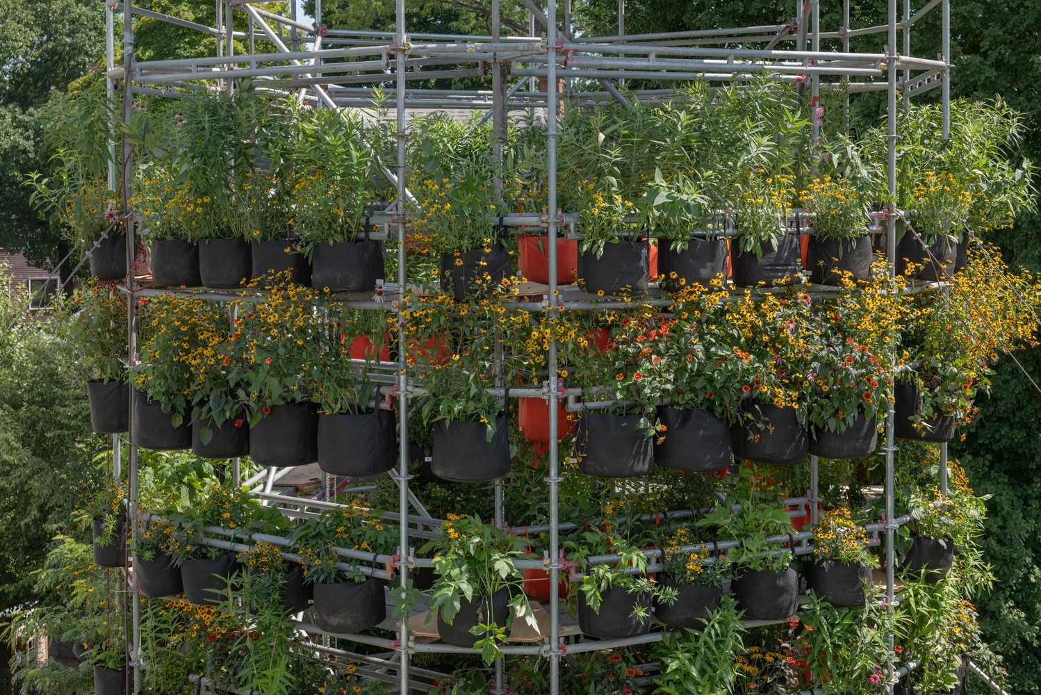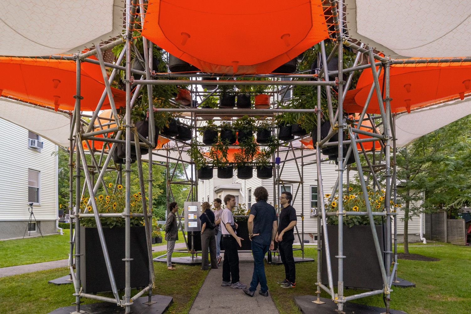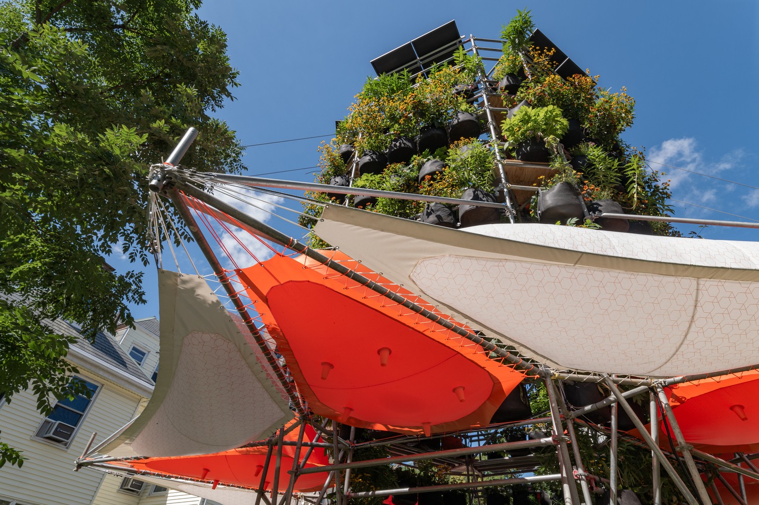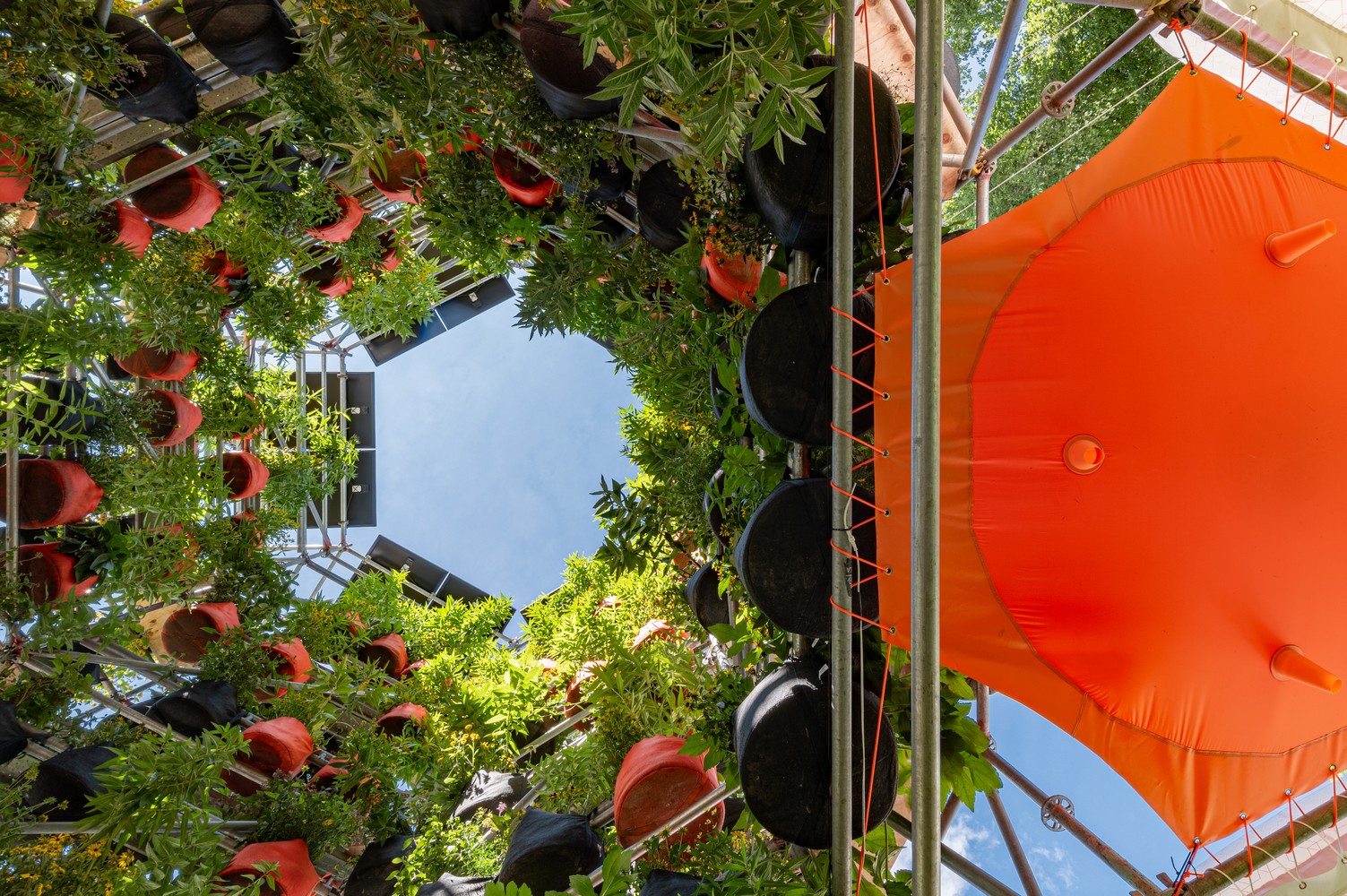 設(shè)計在腳手架結(jié)構(gòu)上放置了1400余種本土花卉植物和可充氣的頂篷,展示了如何通過小規(guī)模干預(yù)對當(dāng)?shù)氐奈夂蚝蜕锒鄻有援a(chǎn)生功能復(fù)合的積極影響。其模塊化特性確保每個部件都可以便捷組裝、拆卸和重新配置,從而提升使用的靈活性,并最大限度地減少浪費。裝置中的植物可以吸引蜜蜂、蜂鳥、帝王蝶等重要傳粉媒介生物。設(shè)計在頂篷上利用了橙色網(wǎng)狀結(jié)構(gòu)和白色照明燈控制溫度和提供照明。同時,設(shè)計采用了傳感器技術(shù),使裝置能夠動態(tài)調(diào)整以適應(yīng)環(huán)境變化,并根據(jù)檢測到的熱量和濕度釋放微風(fēng)來增加使用者的舒適度。此外,這種數(shù)字互動功能使人們能夠觀察到整個場地顯示的實時氣候數(shù)據(jù),從而提高人們的環(huán)境意識和場地可互動性。