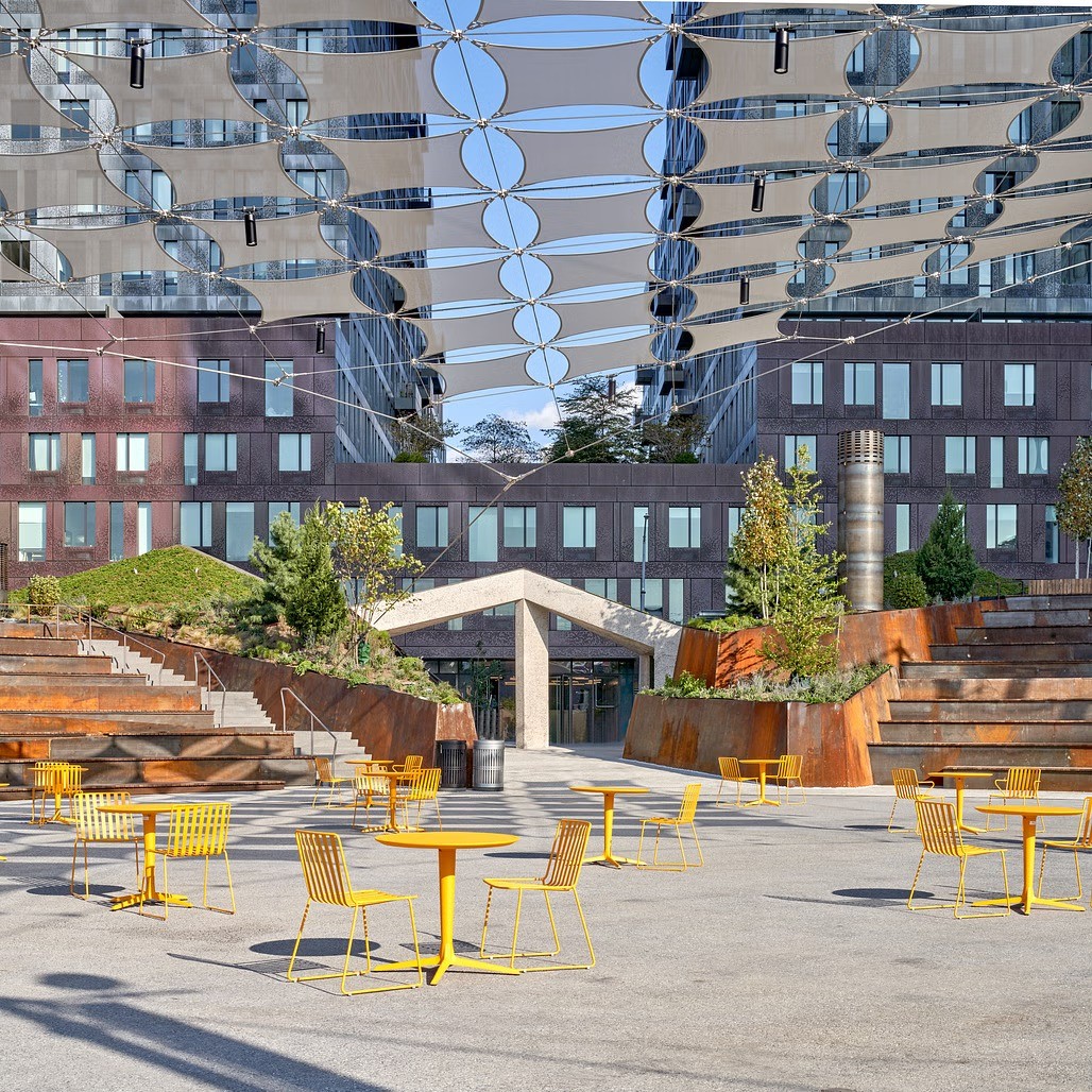 廣場整體呈碗狀,由木質(zhì)的階梯式劇場座位和景觀種植池圍合而成,中心放置了許多組黃色桌椅,讓人們可以在遮陽網(wǎng)下野餐閑聊。木質(zhì)長椅的背面覆蓋著耐候鋼板,呼應(yīng)了該片建筑群的工業(yè)歷史。場地的西南角提供了一片更為休閑的公園景觀,包括私密的角落座椅和休息場所,一系列錯落有致的花壇營造出郁郁蔥蔥的陰涼環(huán)境。