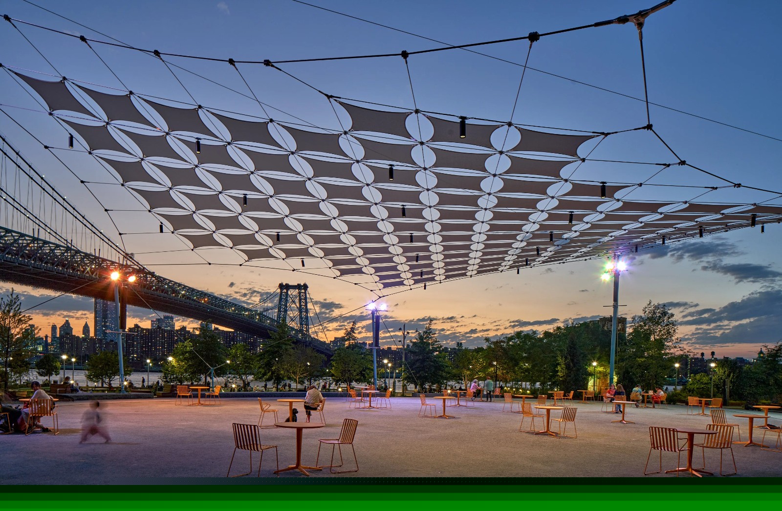 近日,由Field Operations景觀設(shè)計事務(wù)所主持設(shè)計的美國多米諾公園(Domino Park)的最后部分——多米諾廣場(Domino Square)建成并正式開放。多米諾公園建于紐約市布魯克林威廉斯堡海濱的多米諾糖廠舊址上,總面積約2.4hm2。多米諾廣場位于已完工的One Domino Square住宅區(qū)和The Refinery at Domino辦公樓之間,占地約3093㎡,用于公眾聚會和社交,并提供零售服務(wù),在冬天可作為海濱溜冰場使用。