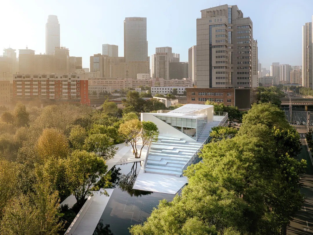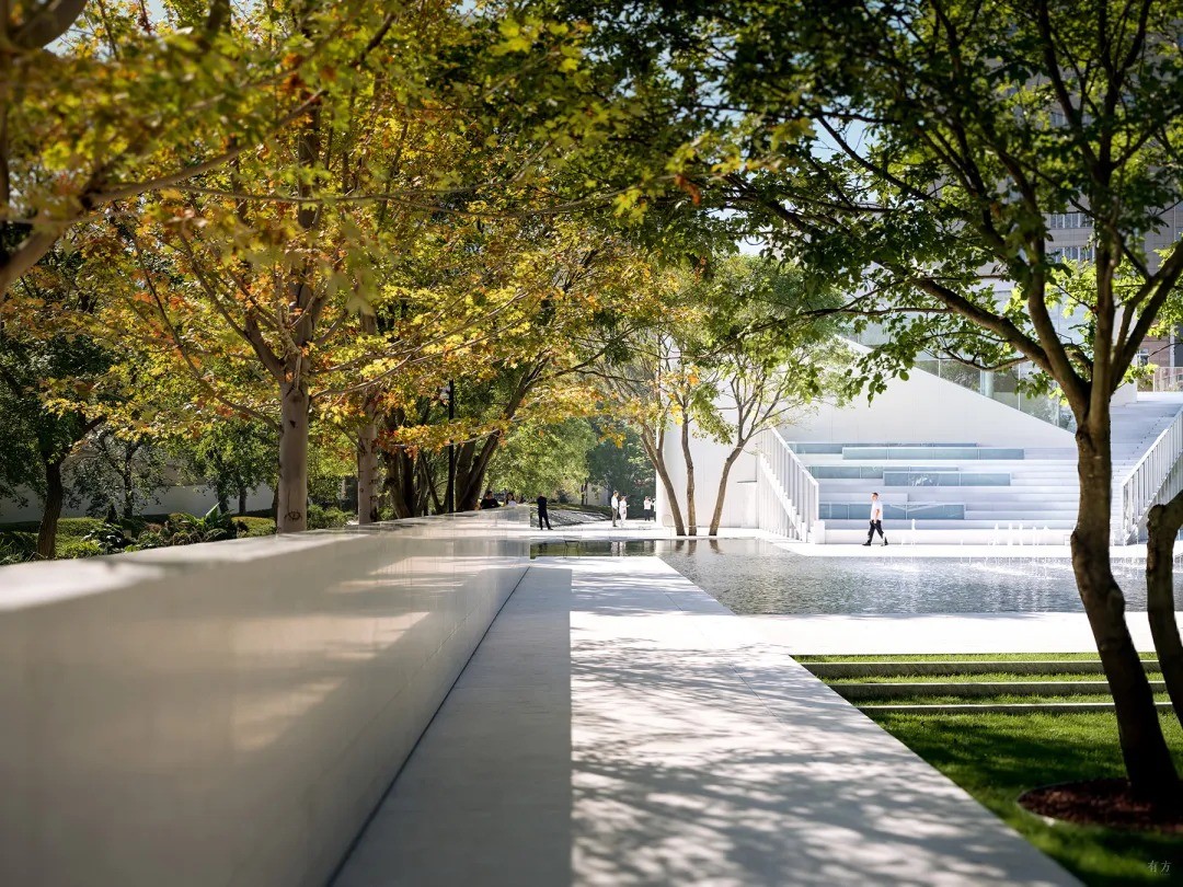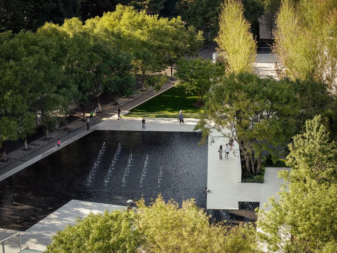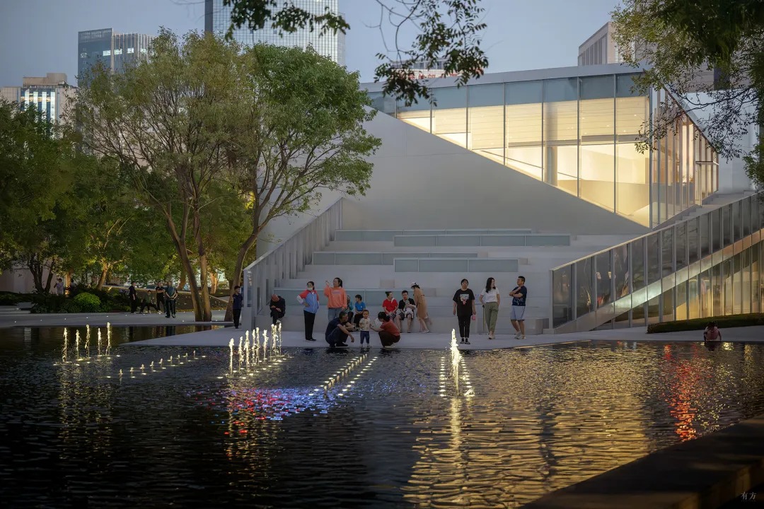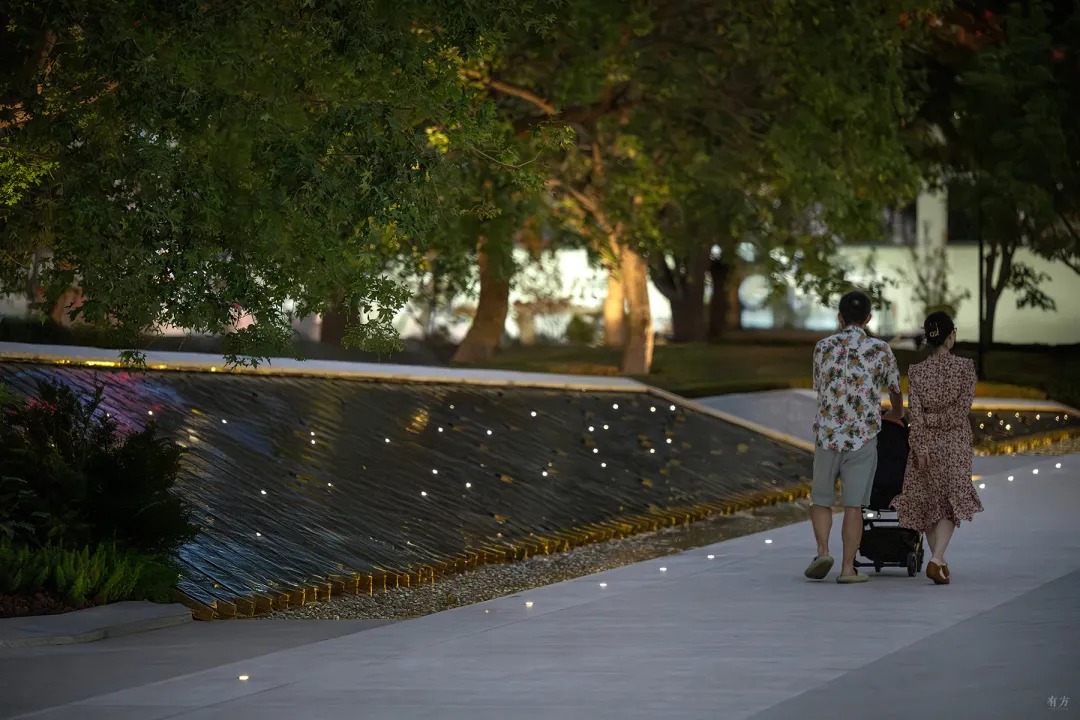 設(shè)計首先整理市政界面,其次清理現(xiàn)有喬木下的底層空間,并采取“道路公園化”策略擴充場地邊界,最后整合碎片化景觀區(qū)域,構(gòu)建“綠色大基底”。其中,“鏡水浮橋”節(jié)點串聯(lián)著場地的功能建筑、噴泉水池與密林,在陽光和微風(fēng)下體現(xiàn)著樹影變化。設(shè)計為疊水池營造了細(xì)微的變化,讓游客在不同方位、視角下能感受到流水不同的視覺形態(tài),帶來視聽享受。大樹花園中的紅色礫石、景墻和草花地被,為游客提供了密集城市中休憩、放松的好去處。